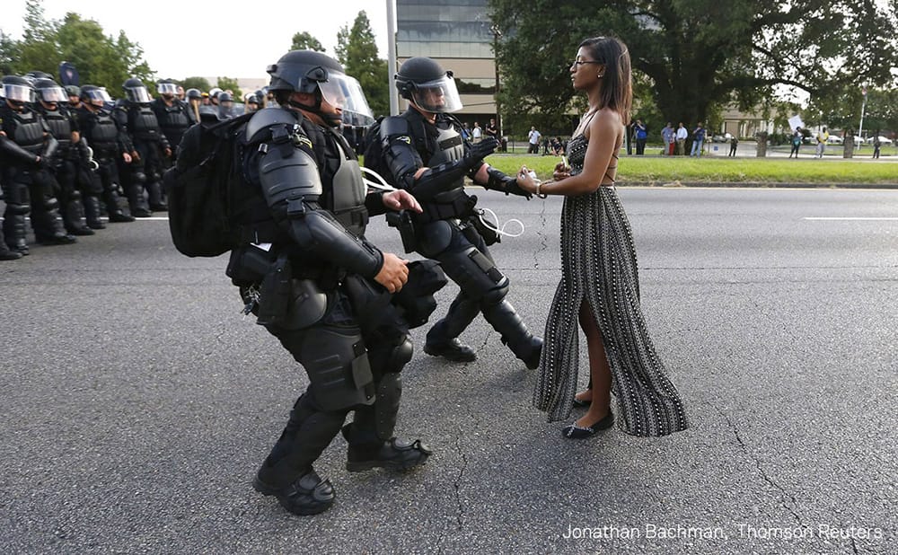 Contemporary Issues: Jonathan Bachman (Thomson Reuters) for an image of protester Ieshia Evans standing her ground against the Baton Rouge Police Department.