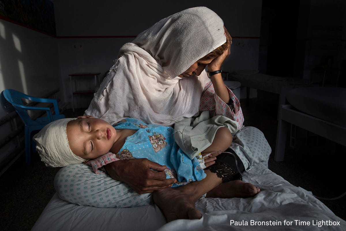 Daily Life: Paula Bronstein (Time Lightbox / Pulitzer Center For Crisis Reporting) for an image a woman, Najiba, holding her two-year-old nephew Shabir who was injured from a bomb blast in Kabul on March 29, 2016.