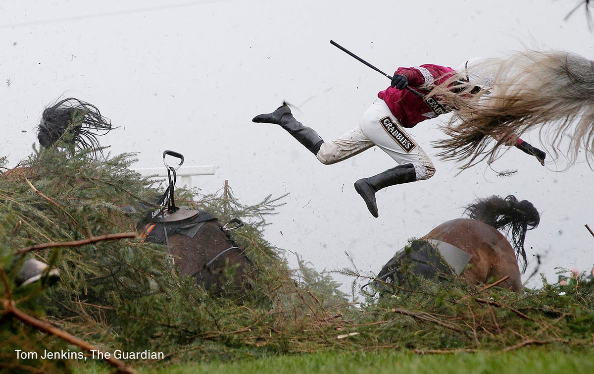 Sports: Tom Jenkins (The Guardian) for an image of jockey Nina Carberry flying off her horse, Sir Des Champs, during the Grand National steeplechase in Liverpool, UK.