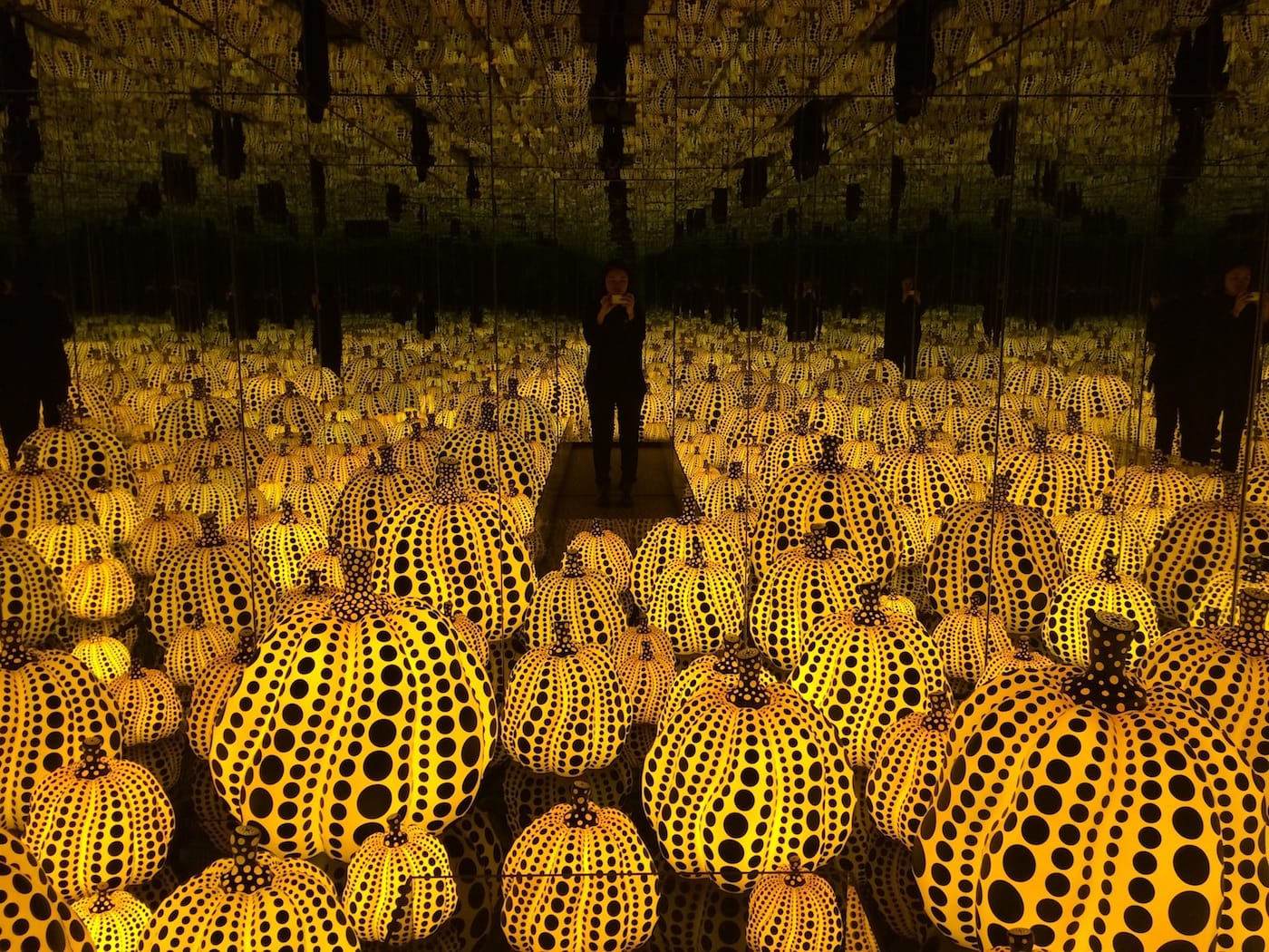 We’re less than a week into the selfie wonderland that is Yayoi Kusama’s exhibition Infinity Mirrors at the Hirshhorn Museum, and the inevitable has already happened. Over the weekend, according to visitors, someone attempting to take a selfie in the artist’s newest mirror room, “Infinity Mirrored Room — All the Eternal Love I have for the Pumpkins” (2016),” fell into the gleaming patch of pumpkin sculptures and broke one of the spotted glass works.