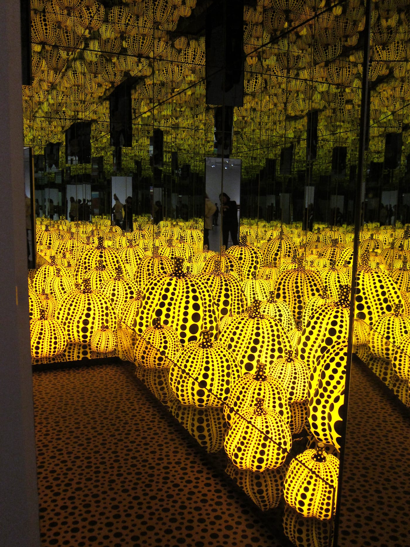 According to museum visitors, someone attempting to take a selfie in Yayoi Kusama's newest mirror room fell into the gleaming patch of pumpkin sculptures and broke one of them.