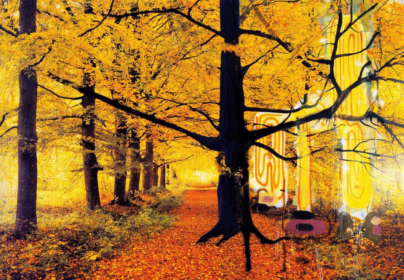 For the collage-painting “Bäume” (2004), Oehlen’s canvas is a large photographic image of a tree-lined path, glistening with sunlight. In the middle of the pathway he has painted an imposing tree, along with luminous yellow ovals and snaking orange lines to one side. The painted tree’s obstruction of the dappled path and the spray-painted look of the orange lines add an element of prankishness to the image, like a graffiti-tagged billboard, that harks back to Oehlen’s early work.