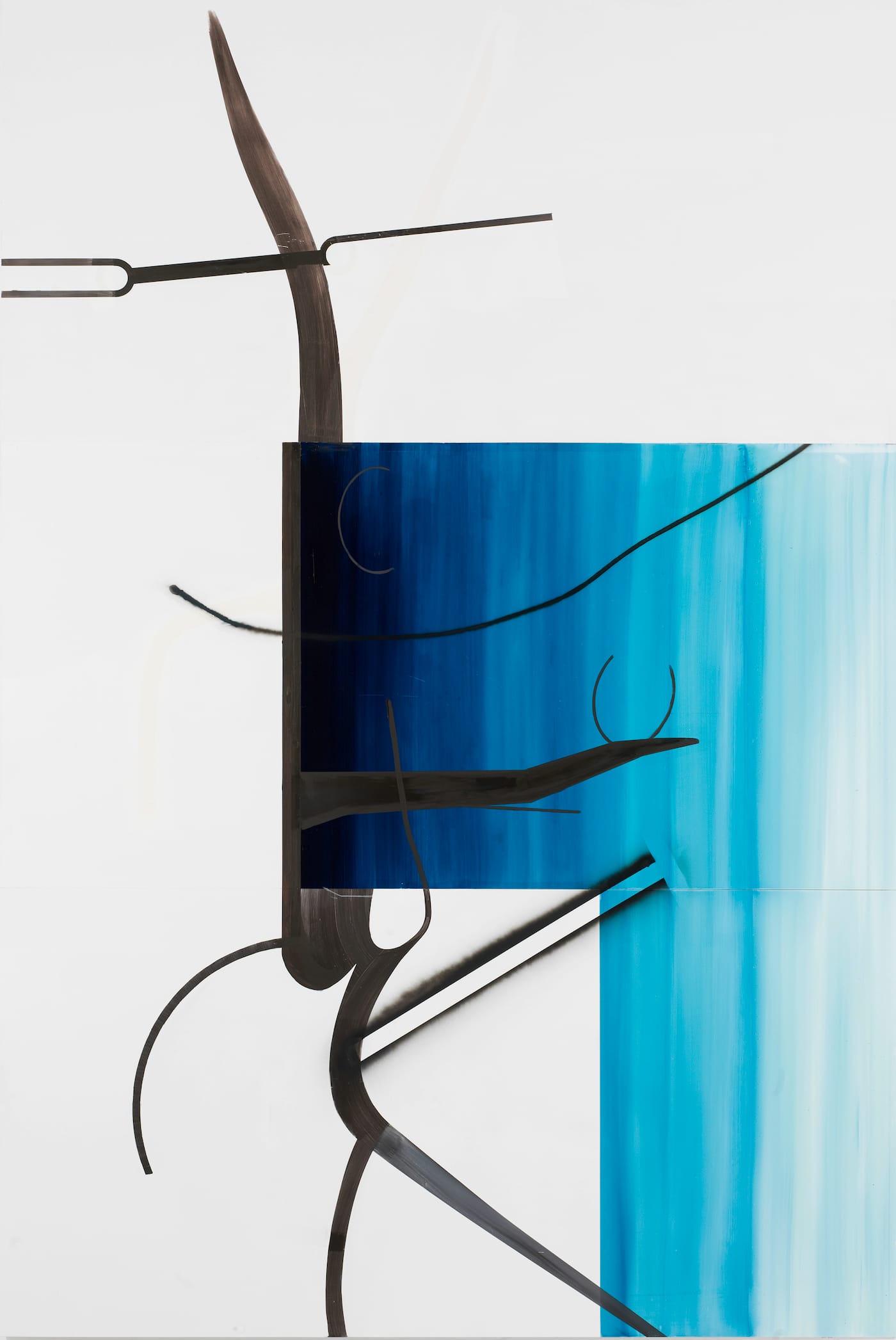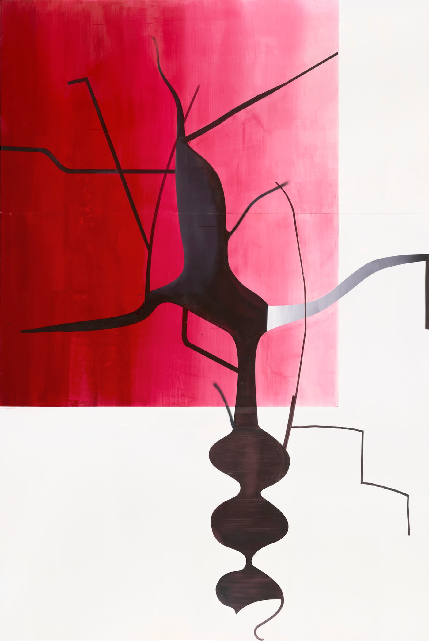 Several of the exhibition’s works belong to a recent series of “Baum” (“Tree”) paintings, for which Oehlen limited his color palette and simplified his compositions. In “Untitled (Baum 2),” done in 2014, a black shape composed of climbing tendrils and descending bulbs hovers in front of a gradated scarlet rectangle on a white ground, while in “Baum 18,” from the same year, a cyan rectangle overlaps and partially obscures an animated black line that spans the height of the canvas, preening and stretching its limbs.