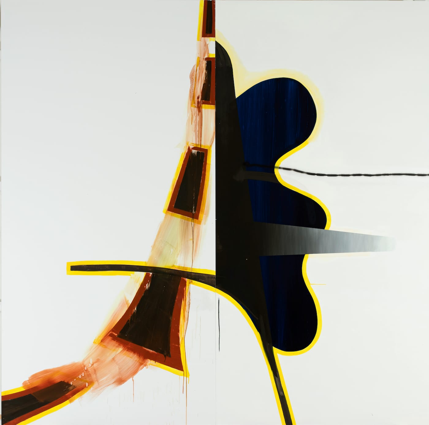 Oehlen picks up the diagonal motif again in “Untitled (Baum 64)” (2016) and “Untitled (Baum 57)” (2015). For the latter, two forms — one a dark, amoebic mass, like an oil spill outlined in yellow, and the other, a diagonal made of interlocking black-and-tan rectangles — abut at the center of the painting, peaking at the top, while three horizontal lines jut outward, simultaneously compressing and pulling apart the composition.