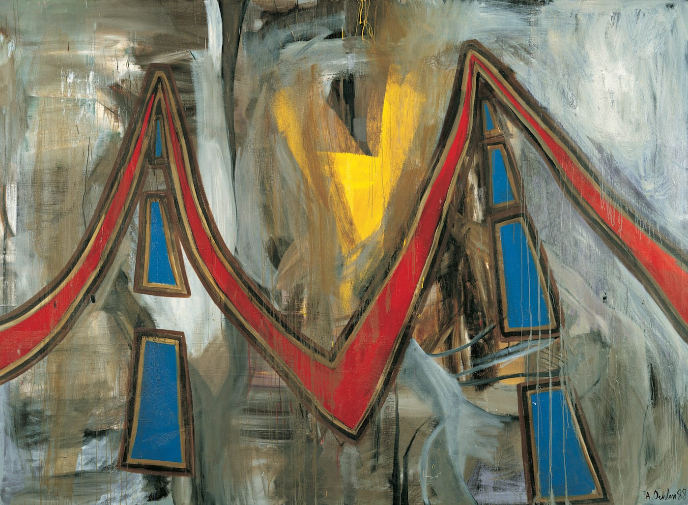 The painting is dizzying, as the red and blue strips assert and recede against a swirl of muted grays, whites, and yellows. The contrast between the triangular lines and the background is like a hallucination in a dense fog.