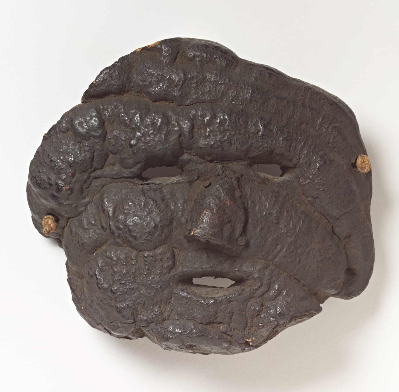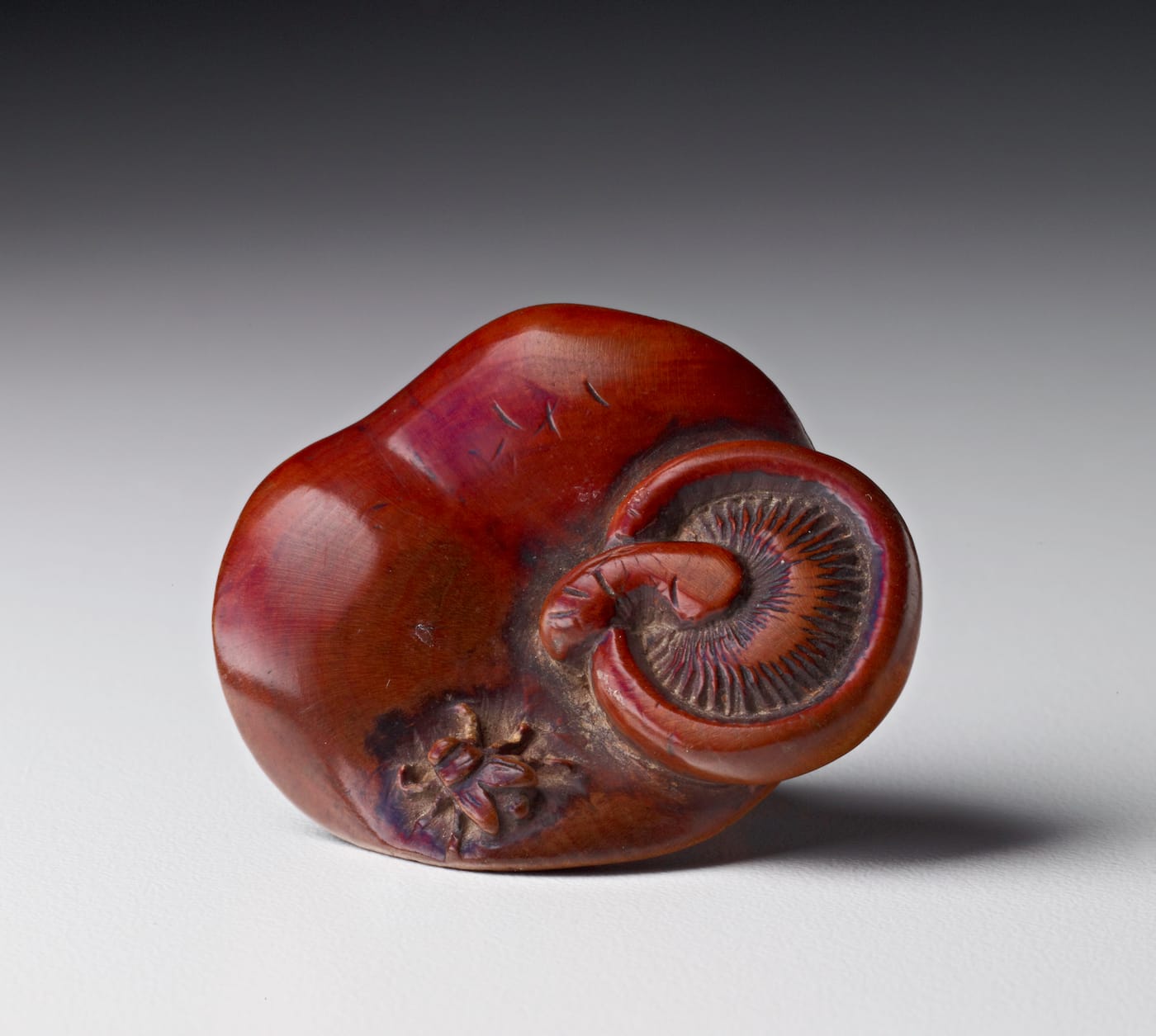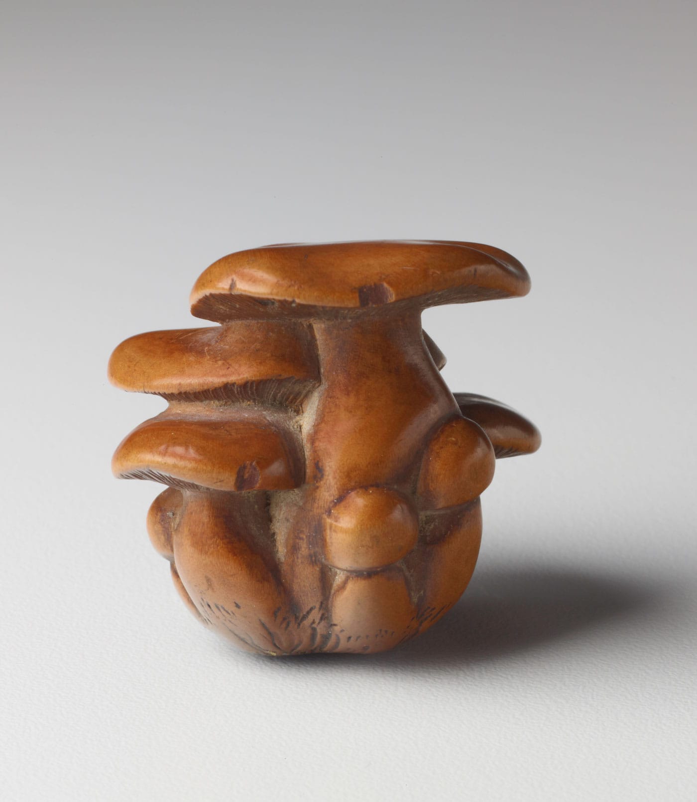 Other objects feature lingzhi more prominently and in secular contexts in which they represent more general notions of longevity. Wispy mushrooms appear on a medicine box among other auspicious motifs like a black turtle, a lotus, and a deer; orange ones adorn a 17th-century painted fan, sprouting behind a Chinese scholar’s rock and an evergreen plant, which are also symbols of good fortune. Tiny, finely carved netsuke are displayed above a porcelain dish, which features a different take on the divine herb-picker: lucky deer forage for lingzhi, not unlike trained pigs who sniff out truffles. There’s also a 19th-century “Mask for a Guardian Spirit,” fabricated by an unknown artist — an example of the lingzhi adopting an anthropomorphic guise. It’s telling that these all arrive from a single collection. Like the spores of the real fungus, the image of the auspicious one spread far and wide, mushrooming in countless forms.