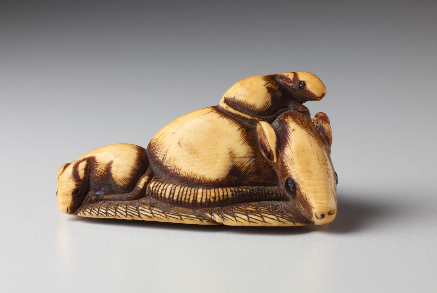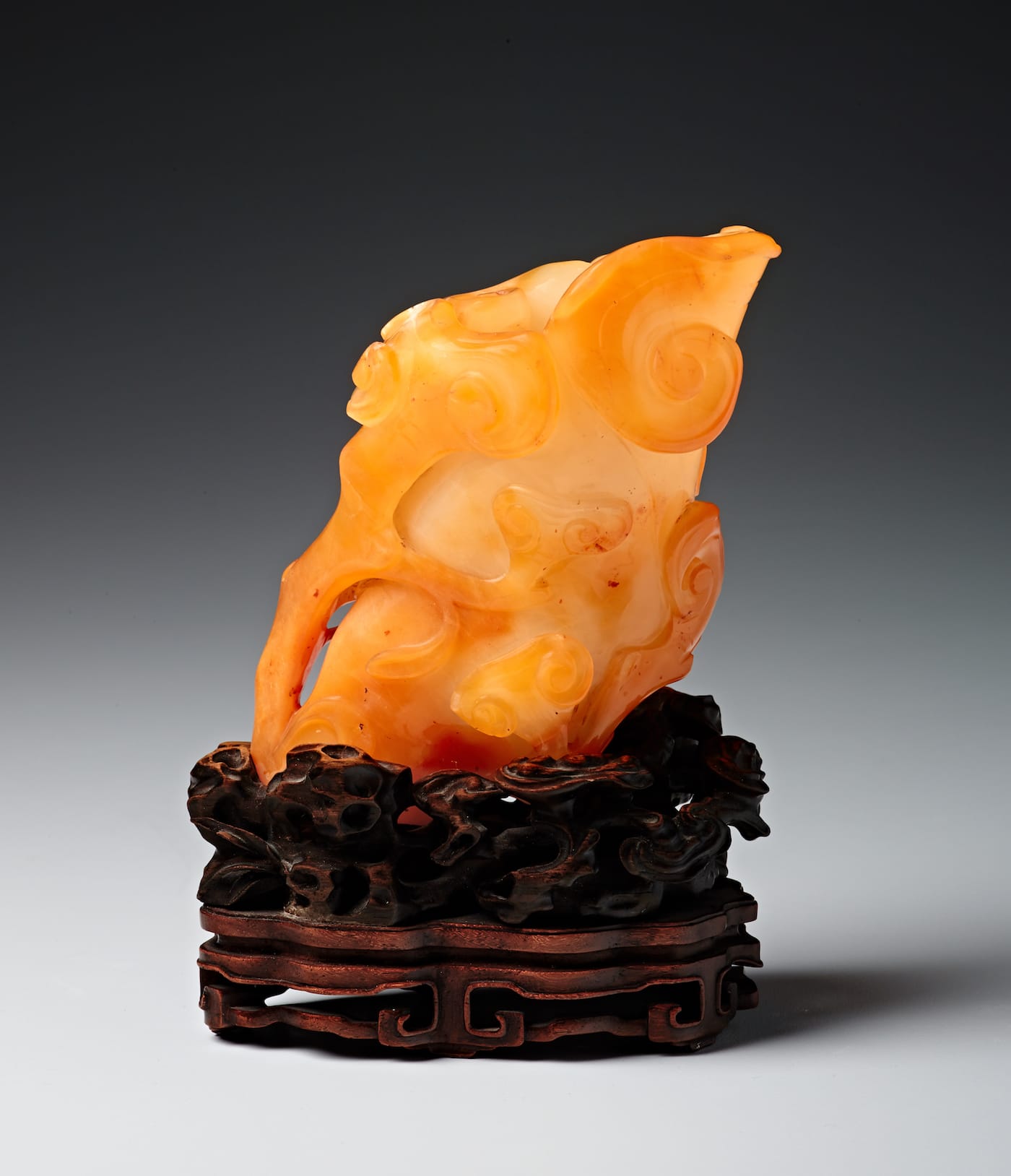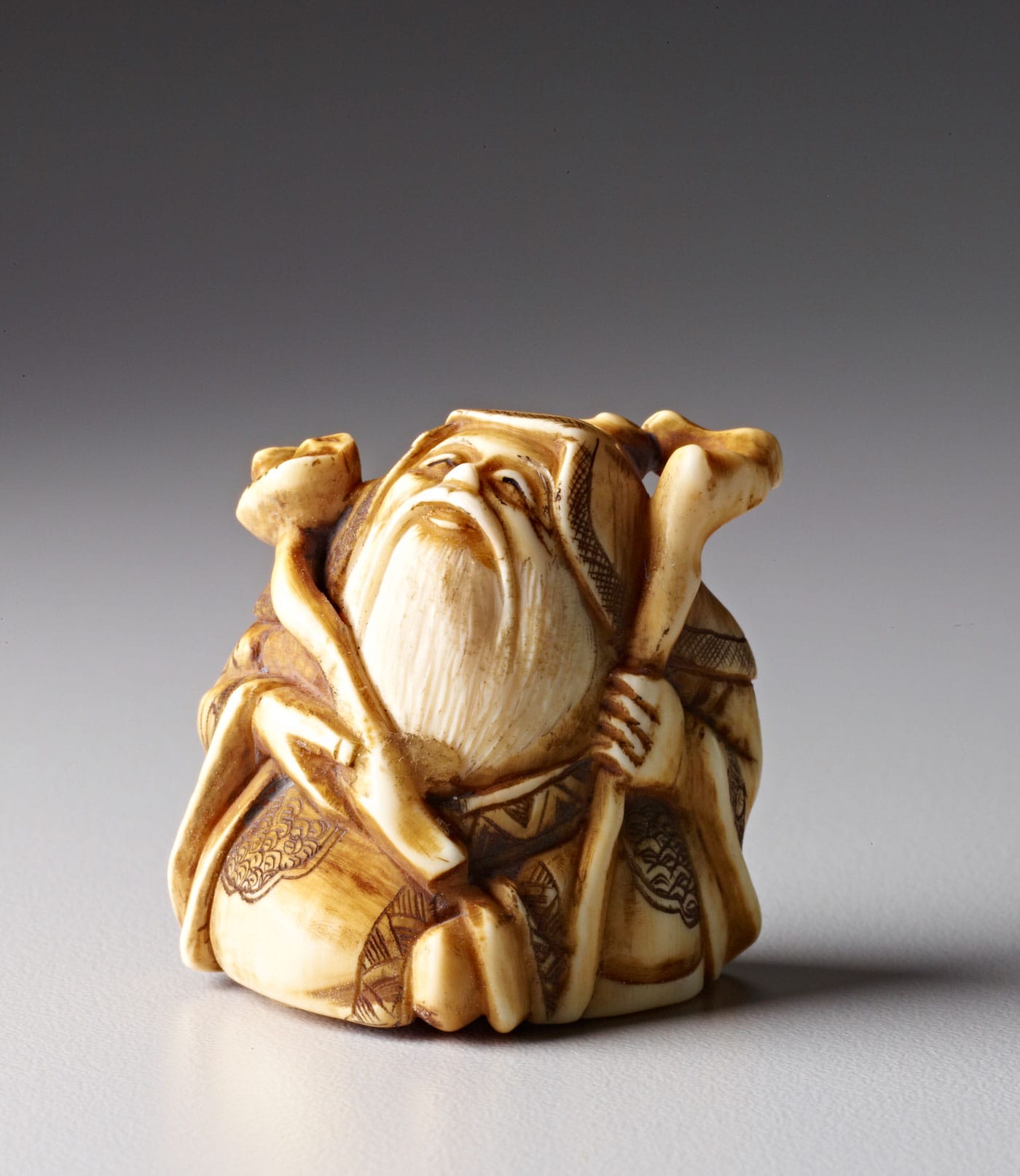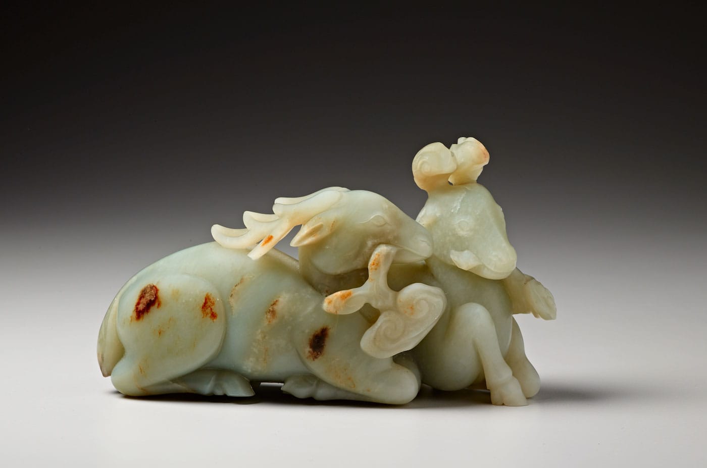 Other objects feature lingzhi more prominently and in secular contexts in which they represent more general notions of longevity. Wispy mushrooms appear on a medicine box among other auspicious motifs like a black turtle, a lotus, and a deer; orange ones adorn a 17th-century painted fan, sprouting behind a Chinese scholar’s rock and an evergreen plant, which are also symbols of good fortune. Tiny, finely carved netsuke are displayed above a porcelain dish, which features a different take on the divine herb-picker: lucky deer forage for lingzhi, not unlike trained pigs who sniff out truffles. There’s also a 19th-century “Mask for a Guardian Spirit,” fabricated by an unknown artist — an example of the lingzhi adopting an anthropomorphic guise. It’s telling that these all arrive from a single collection. Like the spores of the real fungus, the image of the auspicious one spread far and wide, mushrooming in countless forms.