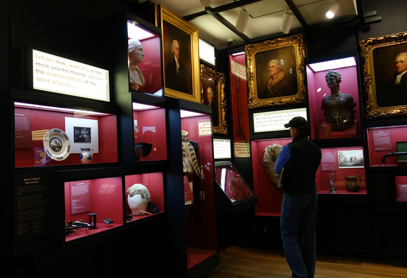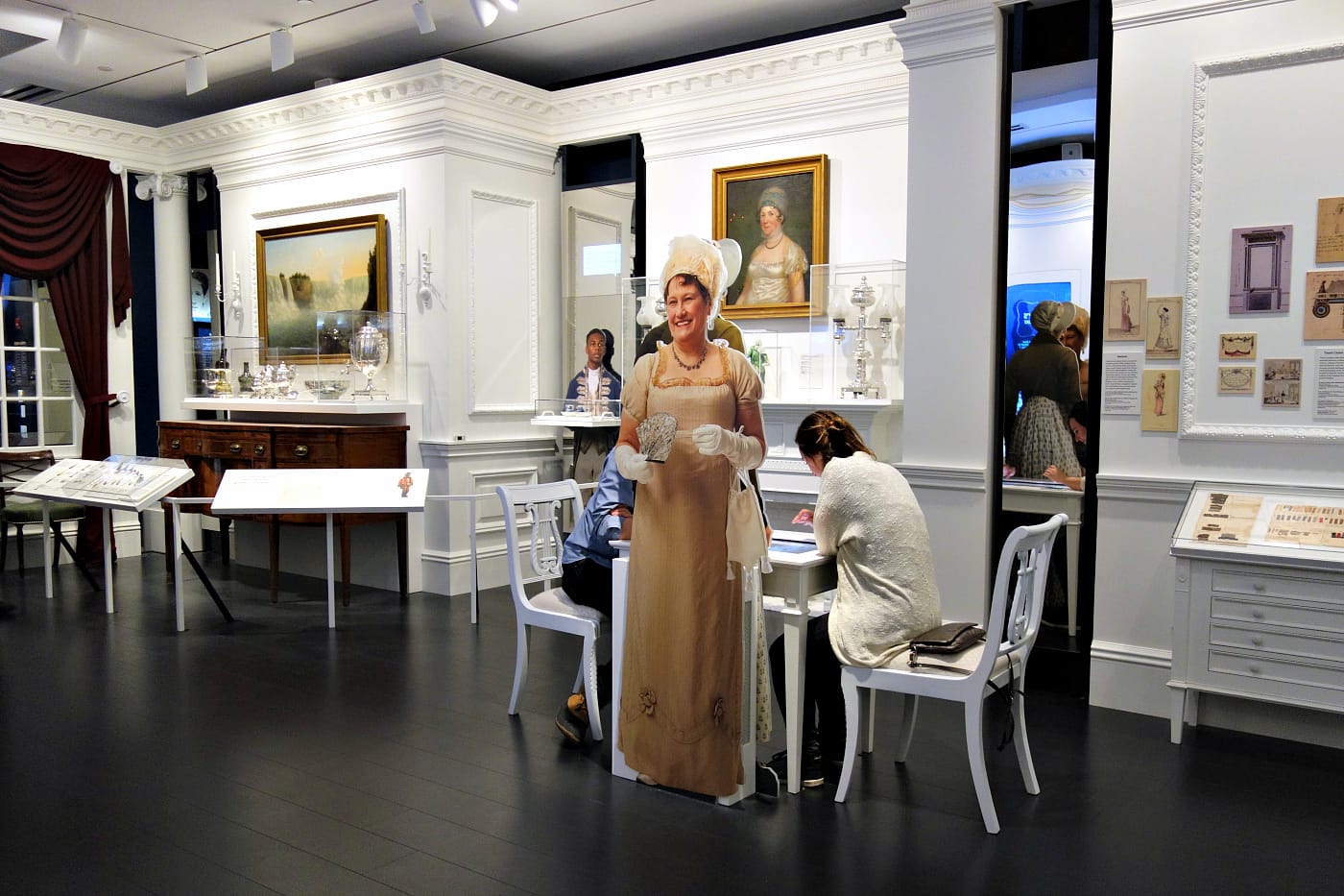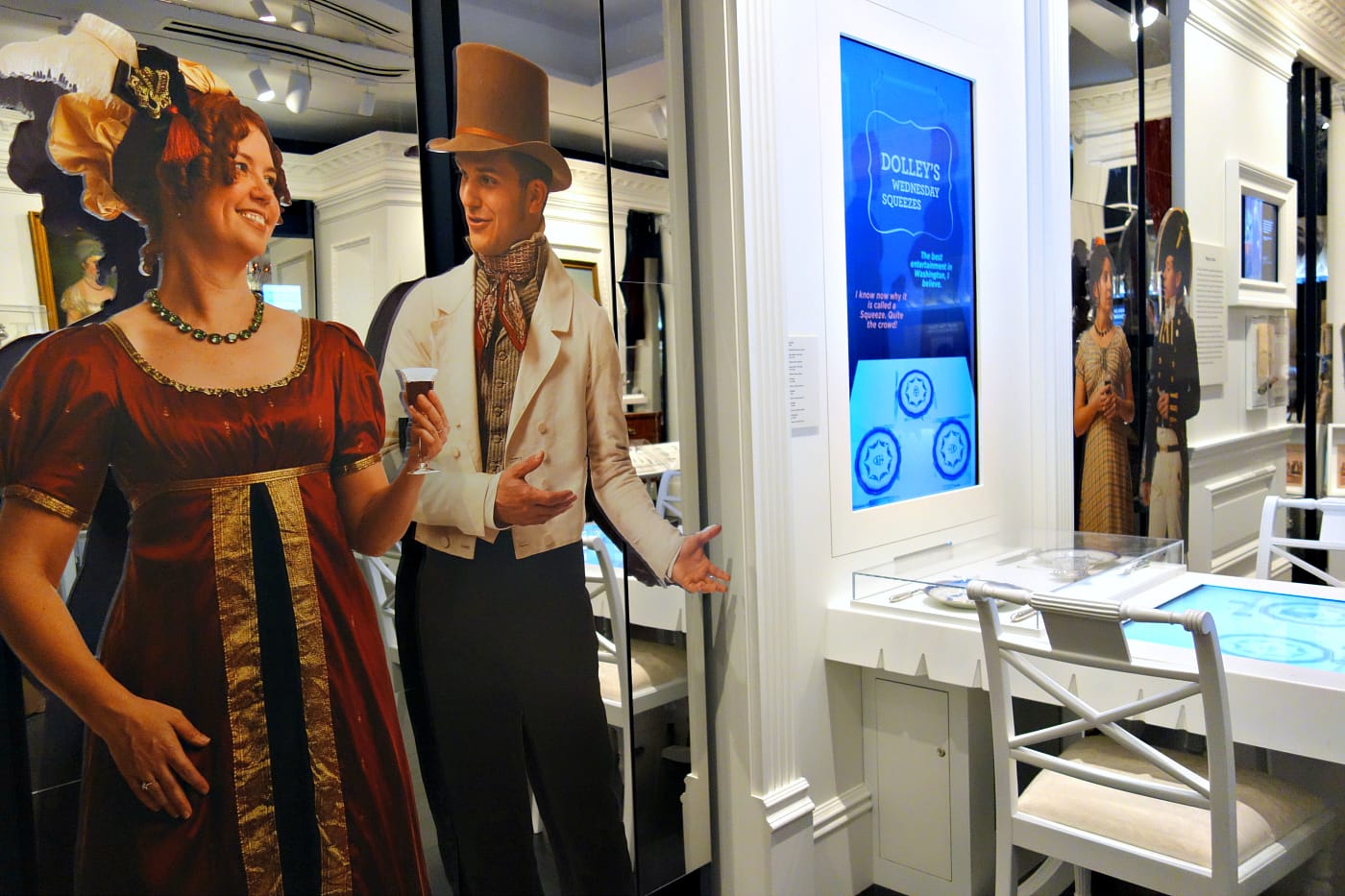 A bright, white central gallery guides visitors into one of Dolley Madison’s “Wednesday Evening Squeezes,” where political representatives from all parties and people across classes mingled in close proximity at the White House; Madison presided, with her plumed headdress and proffered snuffbox. The title of the exhibition, Saving Washington, refers to both Madison’s rescue of the Landsdowne portrait of George Washington from the White House during the War of 1812 fire (with major help from an enslaved man named Paul Jennings), as well as her “saving” of the capital’s political foundation through informal diplomatic discussion and negotiation in the difficult early years of American democracy. Interactive games embedded in tables allow you to become a dinner guest or experience the letter writing that was essential to this communication.