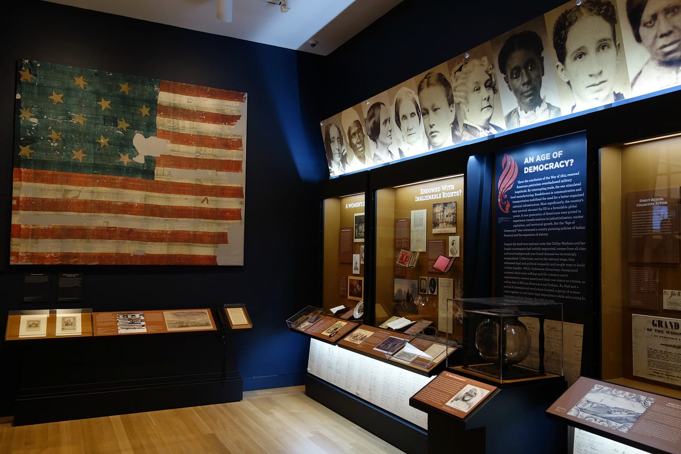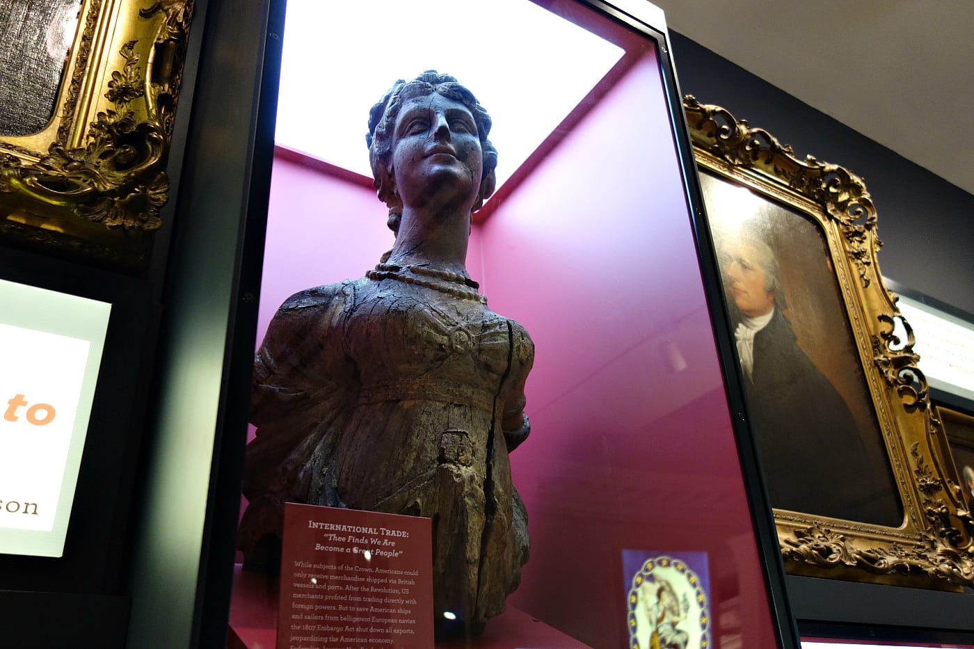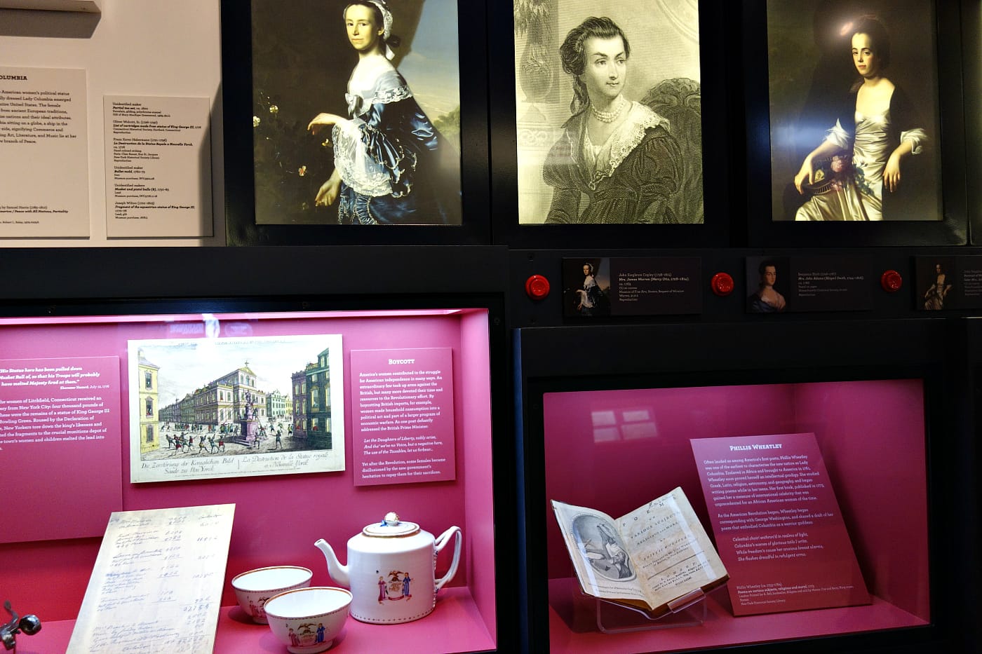 The first gallery swiftly leaves behind the cabinet of masculine mementos to focus on other objects. There are cartridges made from a statue of King George III, melted down by the women of Litchfield, Connecticut, and a 1773 book of poems by Phillis Wheatley, an enslaved woman who was one of the first American poets and among the first to describe America as “Lady Columbia.” Each of these artifacts emphasizes the role women played in the American Revolution and how little they were repaid after the war’s end. Due to the practice of “coverture,” which remained from British common law, married women’s rights were controlled by their husbands. A large gallery touchscreen asks, “We had the Revolution. Now what?” Figures like an “elite woman,” “free black washerwoman,” “wife of Jewish merchant,” and “Cherokee ‘War Woman’” confront the question.