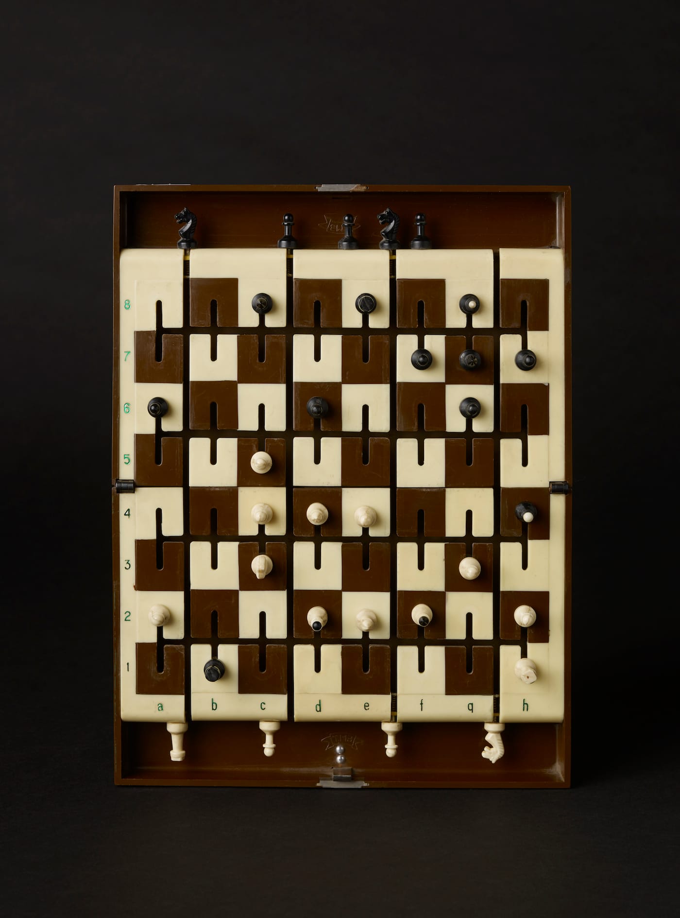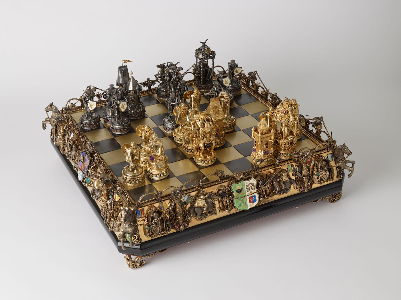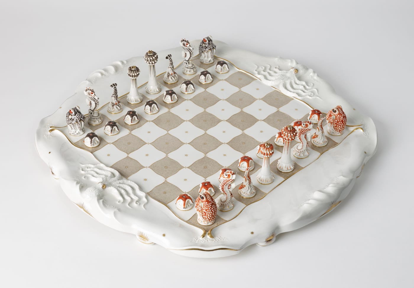 Many of the sets included in Masterworks are by nameless artisans, including craftsmen of the East India Company and those of the House of Fabergé — which produced just two chess sets ever: one of Siberian jade and pale apricot serpentine, and another of silver and silver gilt. A number, though, are attributed to their creators, indicating a turn away from individuals working within established styles toward the 20th century. There’s an exquisite set designed by the sculptor Max Esser, who transformed pearly Meissen porcelain into tiny sculptures of sea life, all set on a board that resembles the white foam of ocean waves. Also elegant are the delicate pieces by mid-19th-century German designers Michael and Anton Edel, who conceived of multiple chess sets with kings and queens on tall pedestals that resemble multi-tiered cakes. A section on 20th century chess sets highlights boards by Ernst, bare-boned but sleek; by Man Ray, who experimented with wood, aluminum, bronze, silver, and ivory to create abstract pieces; and by Josef Hartwig, whose pieces for his now-famous “Bauhaus Chess Set” were carved in forms that cleverly indicate their permitted movements across the checkered arena. Some of the most captivating of boards arrive from the Japanese Fluxus artist Takako Saito, who has made over 100 designs that turn the game into a multi-sensory experience. Various sets of hers feature pieces that vary in scent, in weight, and even in sound — emitted when a player lifts one.