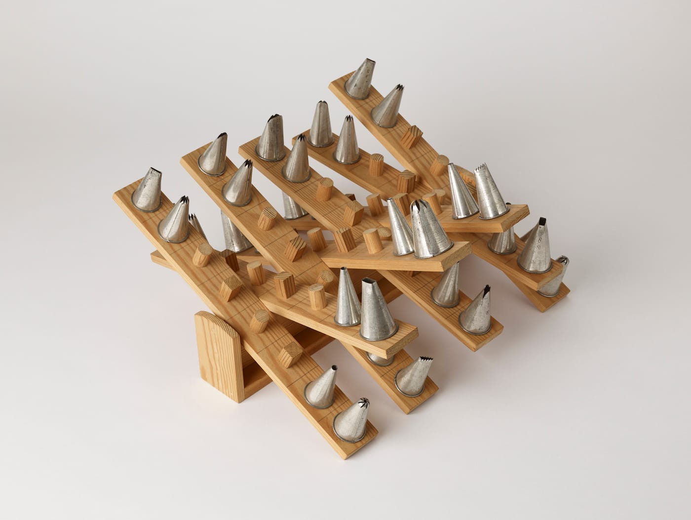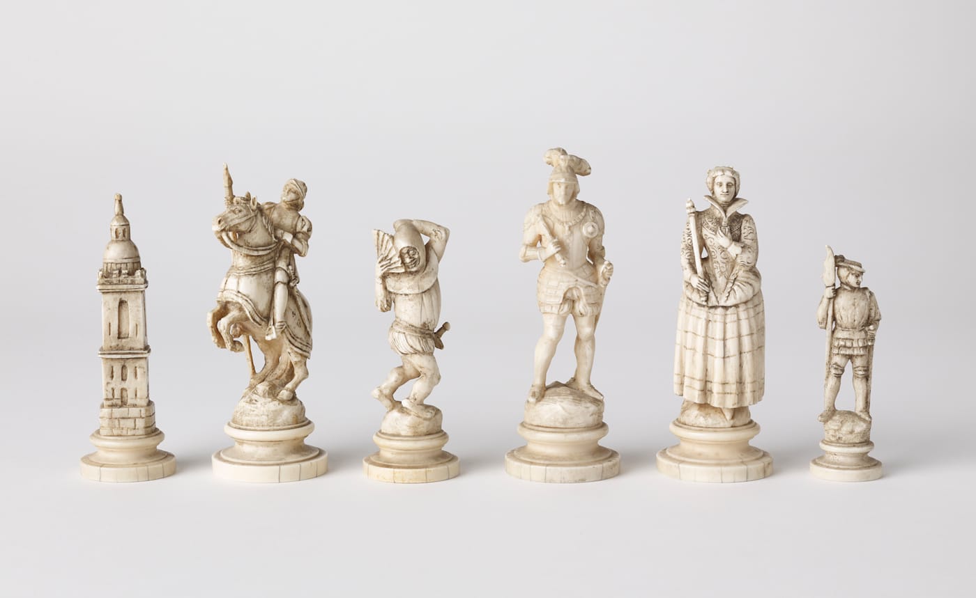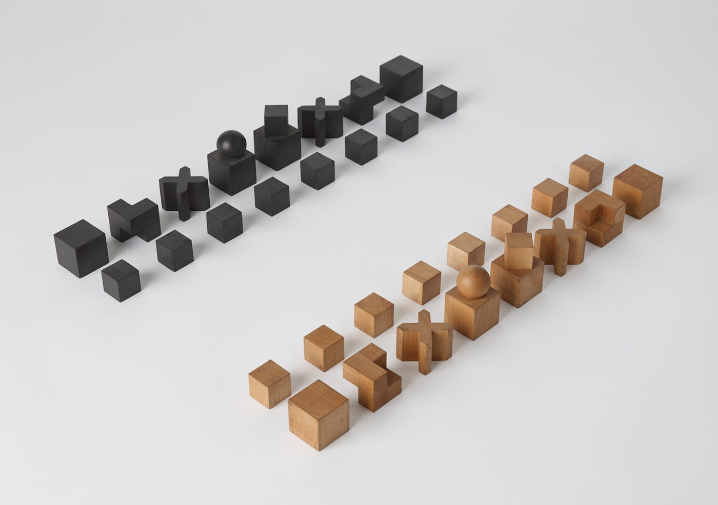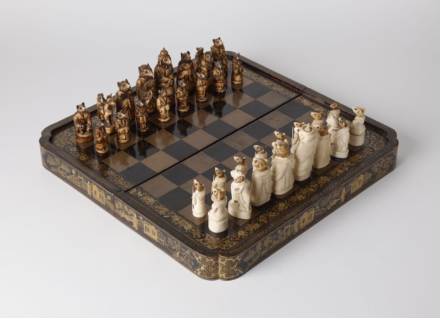 Many of the sets included in Masterworks are by nameless artisans, including craftsmen of the East India Company and those of the House of Fabergé — which produced just two chess sets ever: one of Siberian jade and pale apricot serpentine, and another of silver and silver gilt. A number, though, are attributed to their creators, indicating a turn away from individuals working within established styles toward the 20th century. There’s an exquisite set designed by the sculptor Max Esser, who transformed pearly Meissen porcelain into tiny sculptures of sea life, all set on a board that resembles the white foam of ocean waves. Also elegant are the delicate pieces by mid-19th-century German designers Michael and Anton Edel, who conceived of multiple chess sets with kings and queens on tall pedestals that resemble multi-tiered cakes. A section on 20th century chess sets highlights boards by Ernst, bare-boned but sleek; by Man Ray, who experimented with wood, aluminum, bronze, silver, and ivory to create abstract pieces; and by Josef Hartwig, whose pieces for his now-famous “Bauhaus Chess Set” were carved in forms that cleverly indicate their permitted movements across the checkered arena. Some of the most captivating of boards arrive from the Japanese Fluxus artist Takako Saito, who has made over 100 designs that turn the game into a multi-sensory experience. Various sets of hers feature pieces that vary in scent, in weight, and even in sound — emitted when a player lifts one.