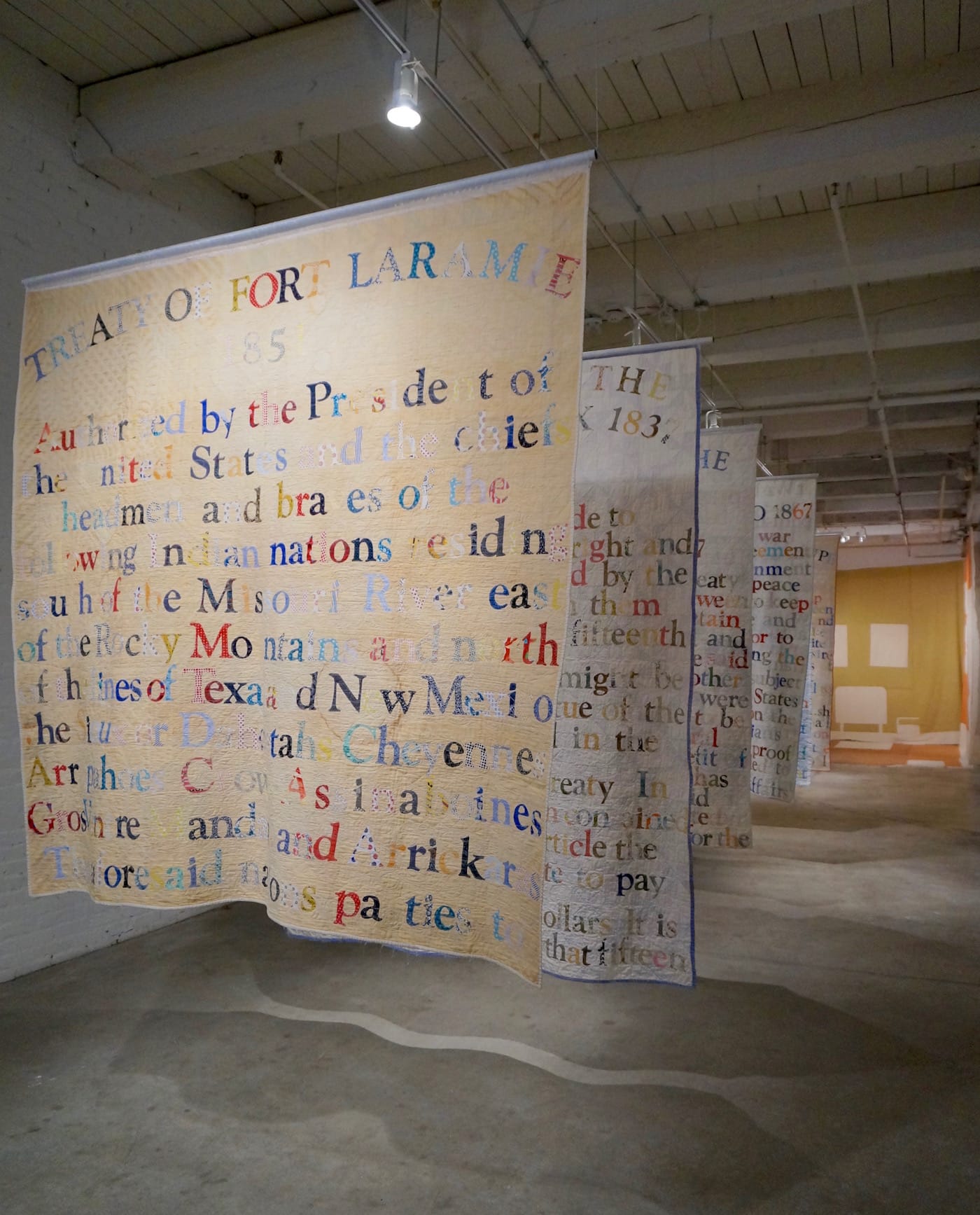 One of the most important is migration itself — or the opposite, a lack of movement. Both positions imply a specific relationship to the land. Take, for example, one of the first works you see upon entering the Bemis: Gina Adams’s Its Honor is Here Pledged, an installation of her Broken Treaty Quilts. Adams makes the works by cutting out letters from new and used calico, then sewing them onto found antique quilts. Each modified quilt contains the text of a different treaty between the US government and Native American nations between 1778 to 1871. One of the quilts at the Bemis displays the 1848 Treaty of Guadalupe Hidalgo, which ended the Mexican–American War and set the new border between the two countries.