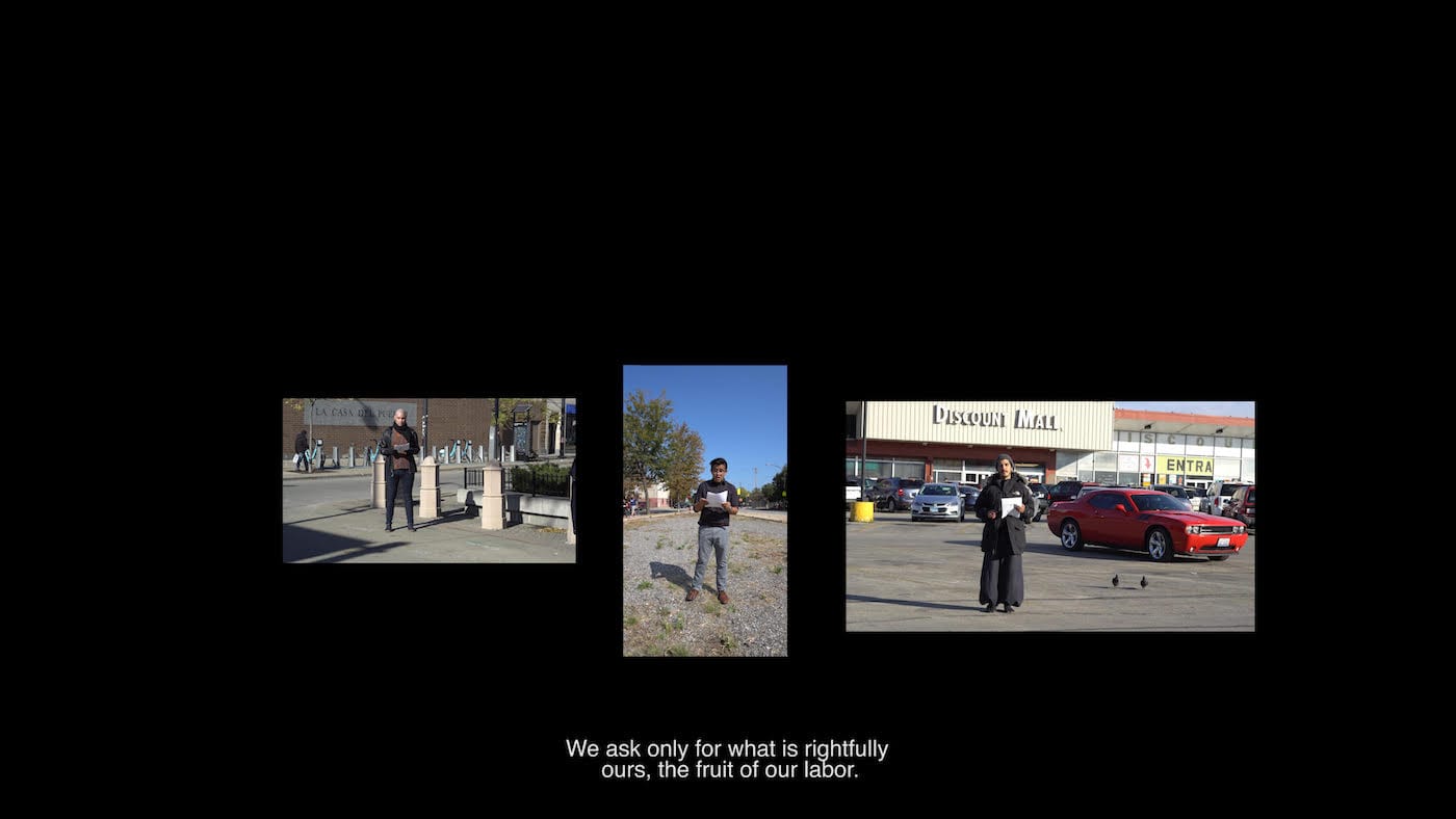 What was once migration becomes displacement: this is both a historical and an ongoing reality for many people in the Americas. Gonzalo Reyes Rodriguez explores it in his multichannel video of immigration and anti-gentrification activists, who read aloud revolutionary speeches from Mexican golden-age films at contested sites around present-day Chicago. At first, the language feels dated and the readers hesitant, their delivery almost deadpan. But as the activists settle into the words, their potential power becomes palpable.