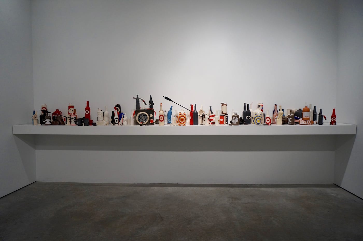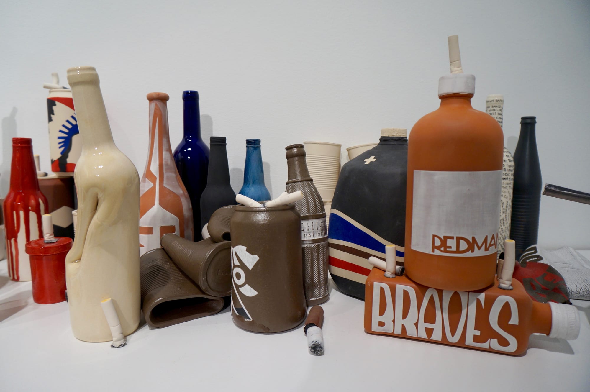 Cannupa Hanska Luger and Marty Two Bulls Jr. render the effects of displacement in their collaboration “Wasted” (2017). The installation is an accumulation of handmade ceramic alcohol containers, which look as though they’ve been shot through with holes, crushed, or topped with cigarettes (also ceramic). Native stereotypes, such as the racist mascot of the Cleveland Indians baseball team, appear on some of the bottles, while sculpted arrows and knives hint at violence. The work is both a remarkable display of skill and a devastating representation of the alcoholism that has plagued Native communities since the arrival of European colonists.