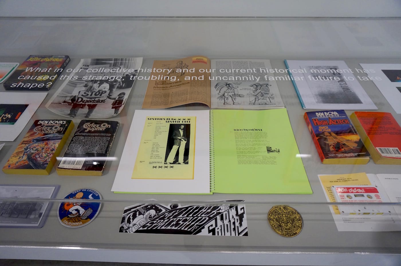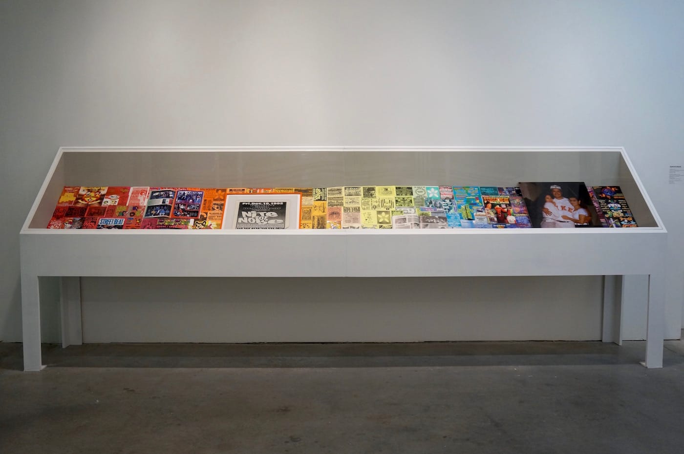 Inheritance is preserved in the archival projects in the show: Guadalupe Rosales’s “Map Pointz” (2017), which displays a rainbow of flyers, photographs, and magazines from the 1990s Latino party crew and rave scene in LA (posted on Instagram at @map-pointz); and Josh Rios and Anthony Romero’s “Is Our Future a Thing of the Past?” (2015–present), a collection of materials related to Brown visions of the future, aka Chicanx Futurism (including a range of work by Chicano science fiction writer Ernest Hogan). They share a gallery with two meditative videos by Sky Hopinka, in which he learns Chinuk Wawa, an indigenous and nearly extinct language, and logs a series of audio recordings sent to him by his father, a powwow musician. All these artists have amassed collections to which they have deeply personal relationships, working as both heirs and protectors.