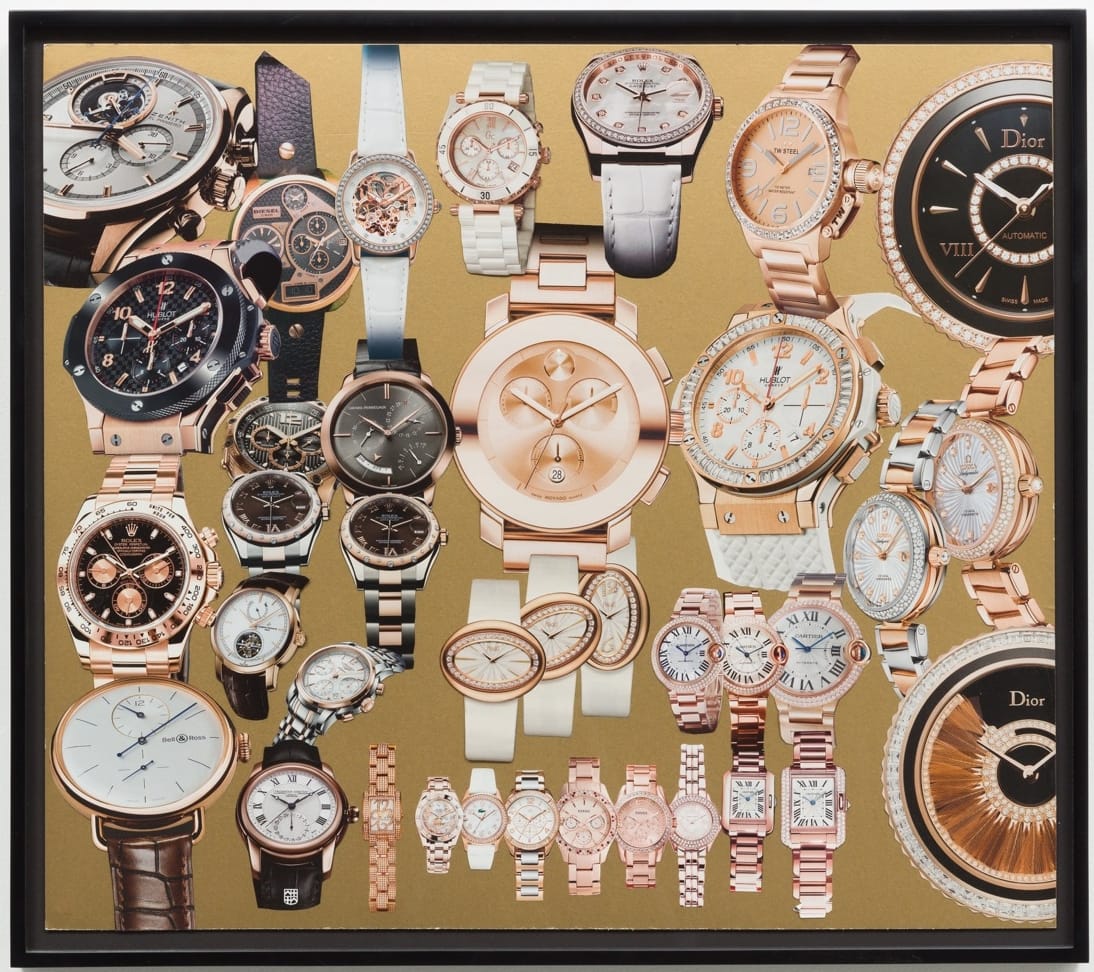 Buchanan’s first solo show with Charlie James Gallery, Consumption, explores that word’s contemporary relevance, meaning both “to use up” and “to acquire,” through four bodies of work. It’s About Time (2014–17) features collages of high-end watch advertisements, highlighting current obsessions with time, status, and luxury. The photographs of bakery confections in 50 Shades of Cake (2013–14) are rendered in sickening shades of gray, layering gustatory appeal and revulsion. These two new series are augmented with earlier works: After California (1999–2017) examines the state’s historic natural landscapes and their recent suburbanization, and two collaborations (1998–2002) with Carolyn Potter, miniature installations incorporating video, depict typical American interiors littered with objects — the end result of unfettered consumption.
