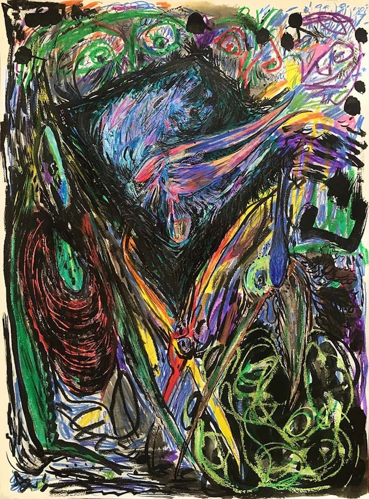 Many of the political drawings are furious with energy. The spewing lines and crowded compositions consolidate the artist’s rage into a focused and precise pitch. There are lots of black splotches, puddles, and pools — oil and sewage, as well as the recurring motif of an ugly little hand signaling a thumbs-up. I was so taken by the ink drawings that I have to confess to not looking carefully enough at the ones in crayon and ink. In them, Koch fills the sheet of paper with swirling, centrifugal marks. It takes a while for some to coalesce into birds, or wings, or part of an owl’s head with its enormous eyes — forms that move between image and abstraction. In the political drawings, Koch does not shift between legibility and illegibility, most likely because to do so would make them art (or arty). It was that artiness that Guston got rid of. I get the feeling that Koch is moving in that direction.
