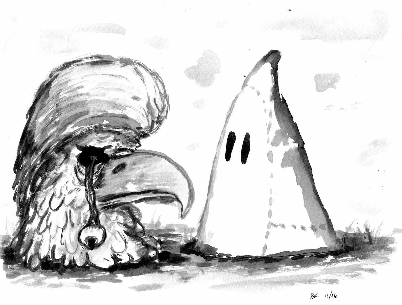 “Obsessed and outraged” are the words I used to describe Philip Guston’s reaction to the administration of President Richard Nixon and his cronies. Philip Roth, his friend and neighbor in upstate New York, was equally disgusted by Nixon and what he represented about the US, a place replete with hatred posing as self-righteousness and bile disguised as religious faith. As Neil Gorsuch’s selection to the Supreme Court proves, that chicken has come home to roost. Roth, whose publication of Portnoy’s Complaint (1969) had turned him into a star, took an unexpected turn and wrote the novel Our Gang (1971) with “Trick E. Dixon” as its central character. Guston, whose art had already taken a startling turn away from abstraction, would make another turn in his work with his Nixon drawings, which he shared only with friends. He became two artists, one making art of hooded figures and the other making political drawings of hoods.