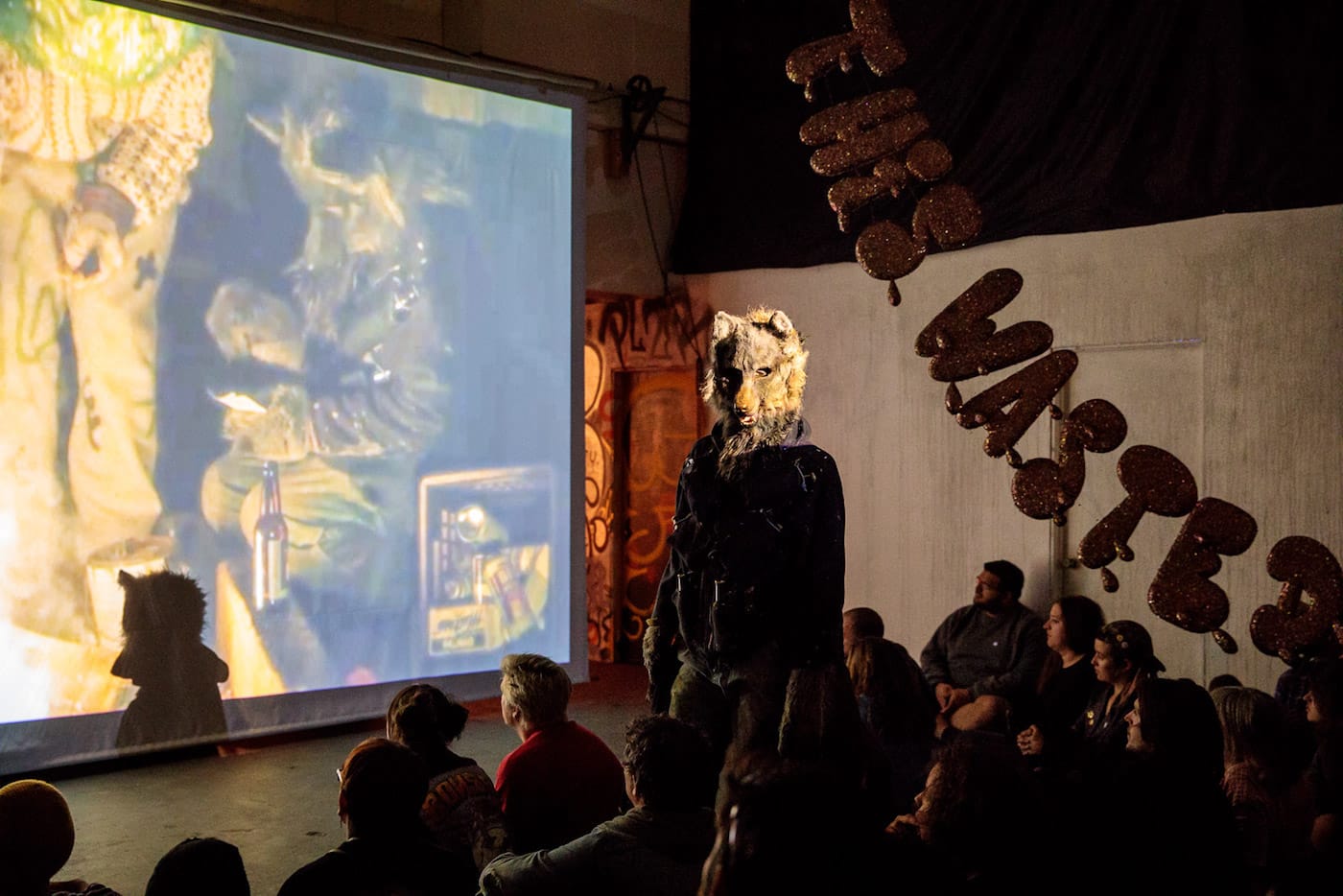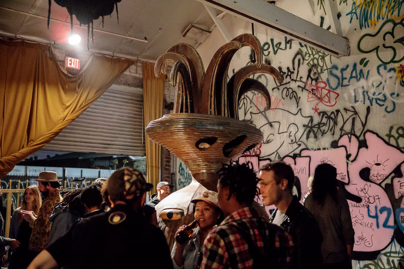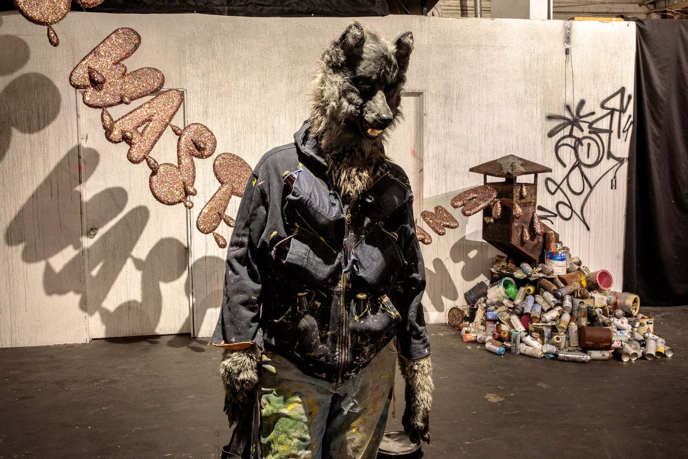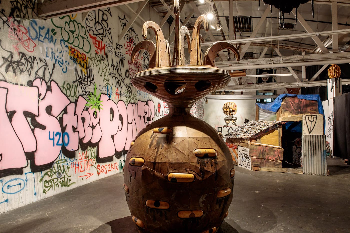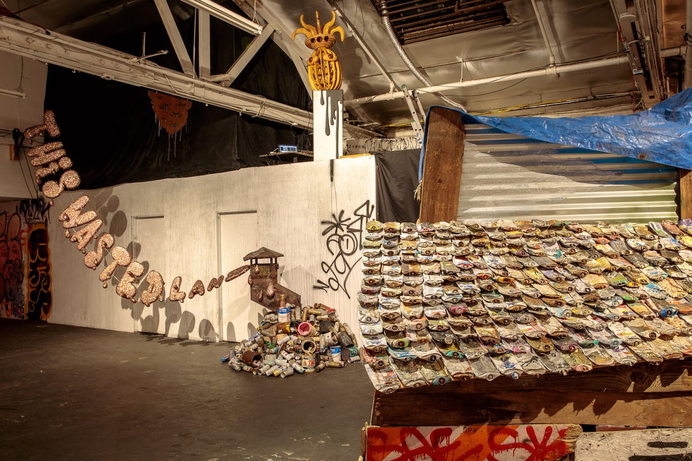 If, on a recent Saturday night, you happened to find yourself walking down a desolate street at the edge of L.A.’s Skid Row, you might have passed an open warehouse roll gate in a building displaying a Swoon mural on the exterior. Inside that warehouse, you would have immediately encountered a giant multi-eyed upside-down alien next to a wolf serving fresh popcorn. A film was screening deep inside the space, and if you made your way past the small shack with a roof made of compressed spray cans — and didn’t trip over another pile of empty paint cans with a small metal chimney spewing glittery cloud letters — you would have joined a room full of people watching Wastedland 2, the most recent work by punk filmmaker Andrew H. Shirley.