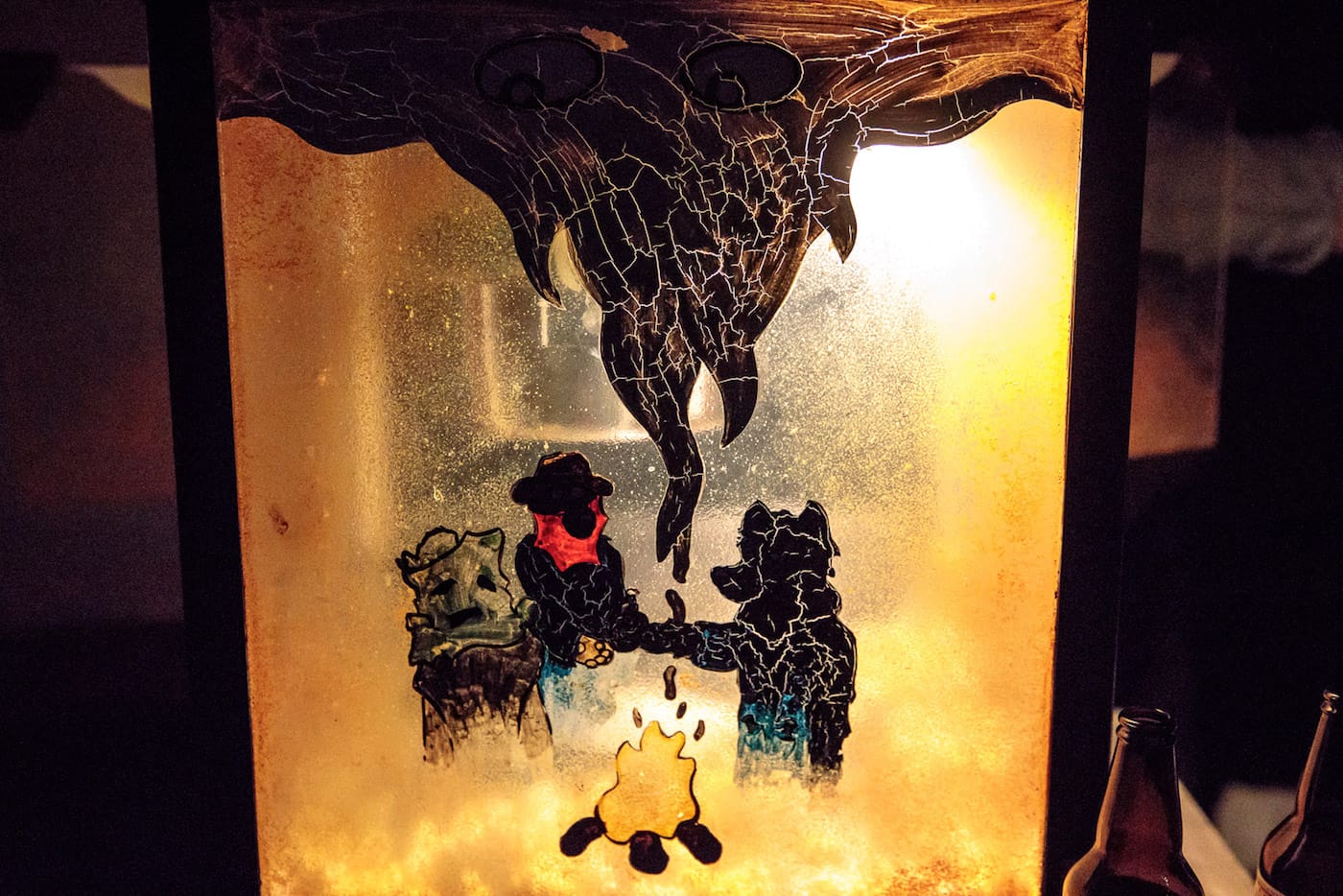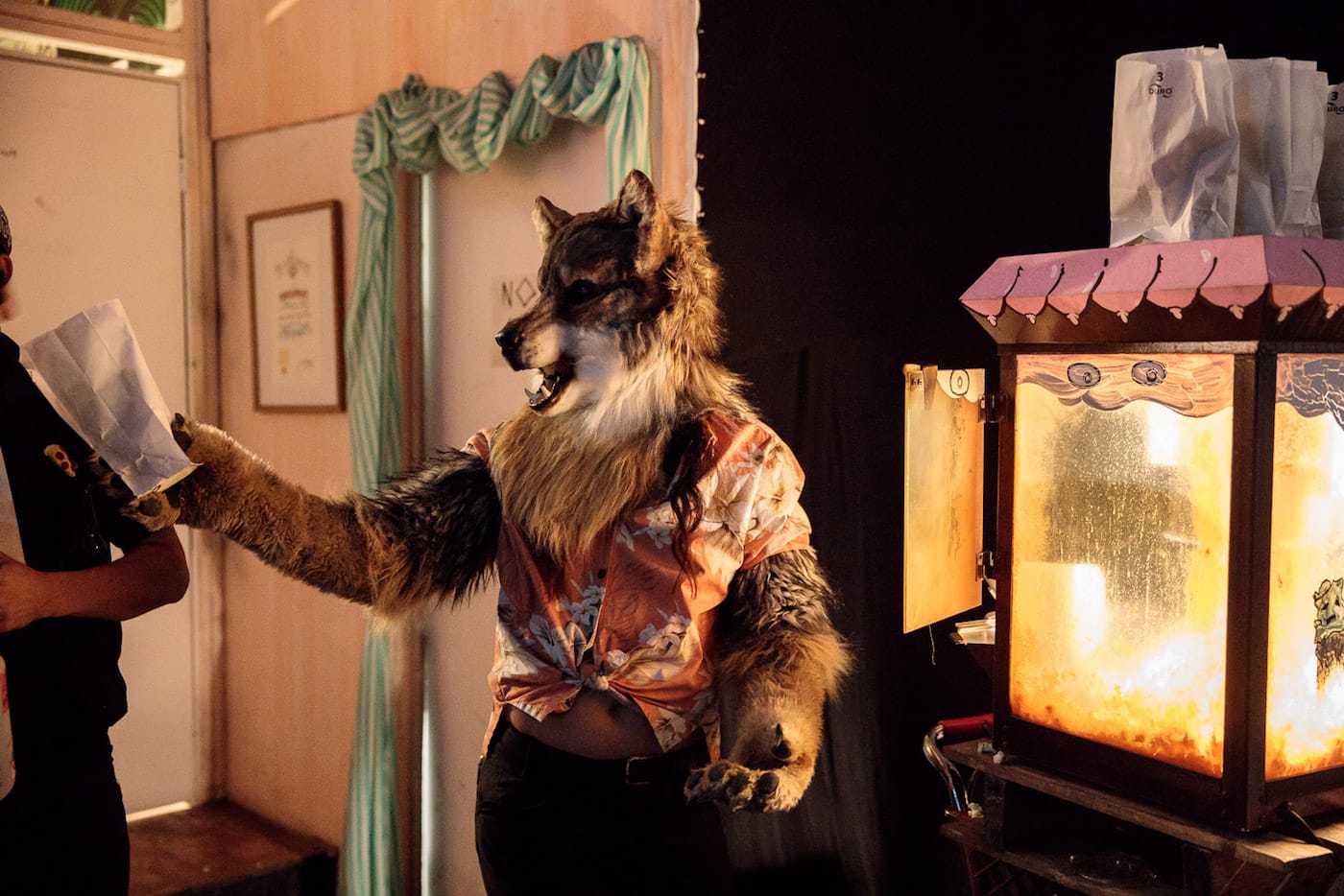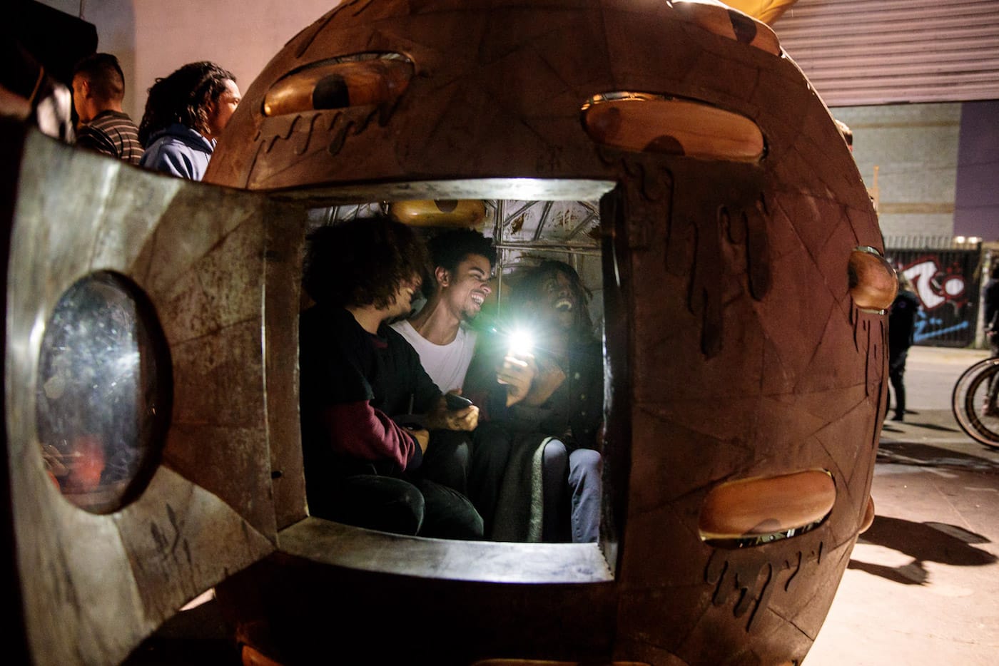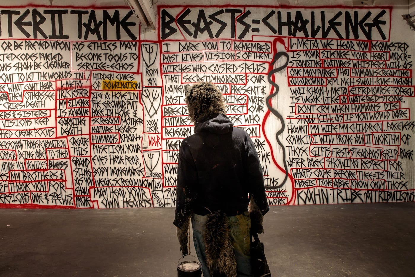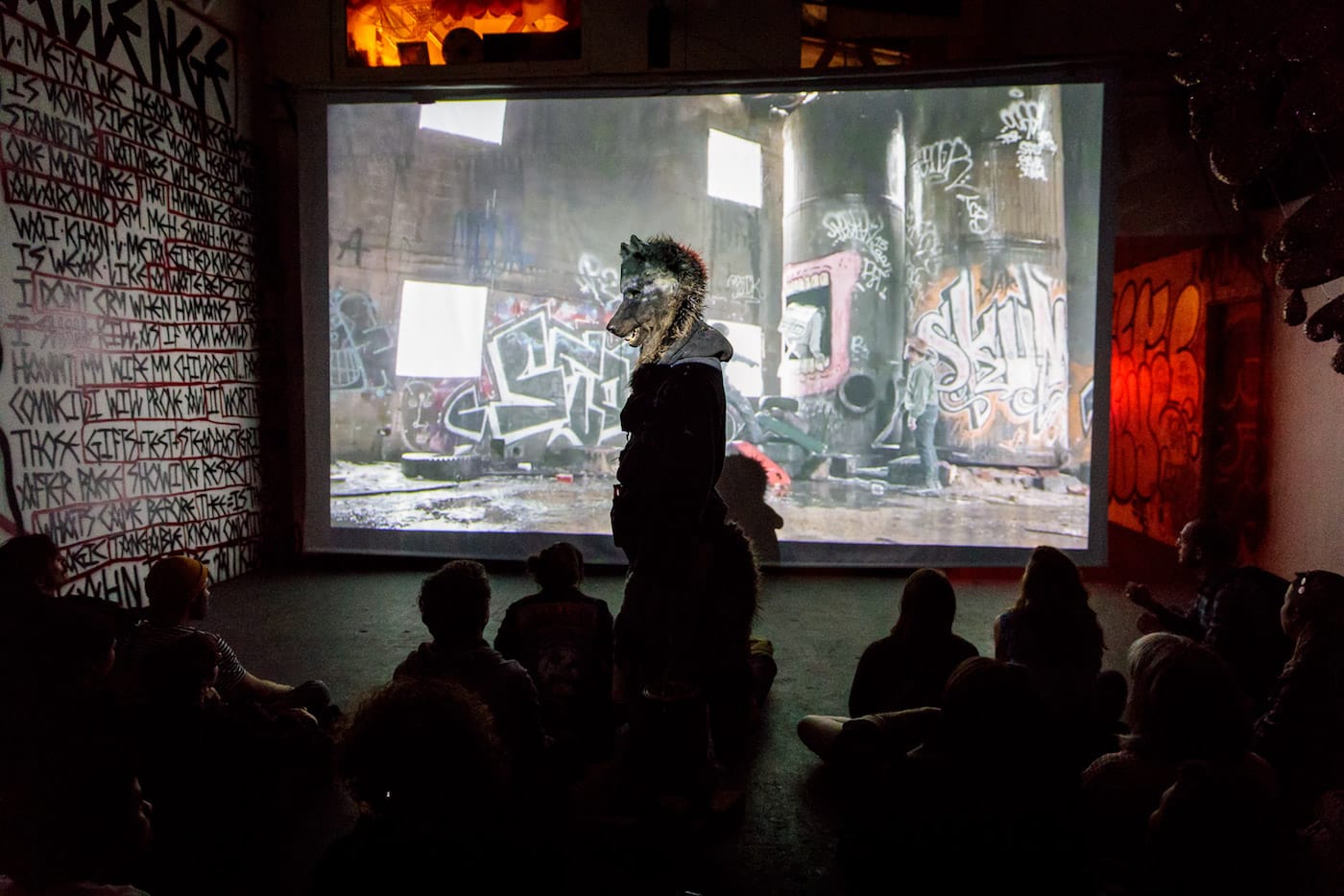 If, on a recent Saturday night, you happened to find yourself walking down a desolate street at the edge of L.A.’s Skid Row, you might have passed an open warehouse roll gate in a building displaying a Swoon mural on the exterior. Inside that warehouse, you would have immediately encountered a giant multi-eyed upside-down alien next to a wolf serving fresh popcorn. A film was screening deep inside the space, and if you made your way past the small shack with a roof made of compressed spray cans — and didn’t trip over another pile of empty paint cans with a small metal chimney spewing glittery cloud letters — you would have joined a room full of people watching Wastedland 2, the most recent work by punk filmmaker Andrew H. Shirley.