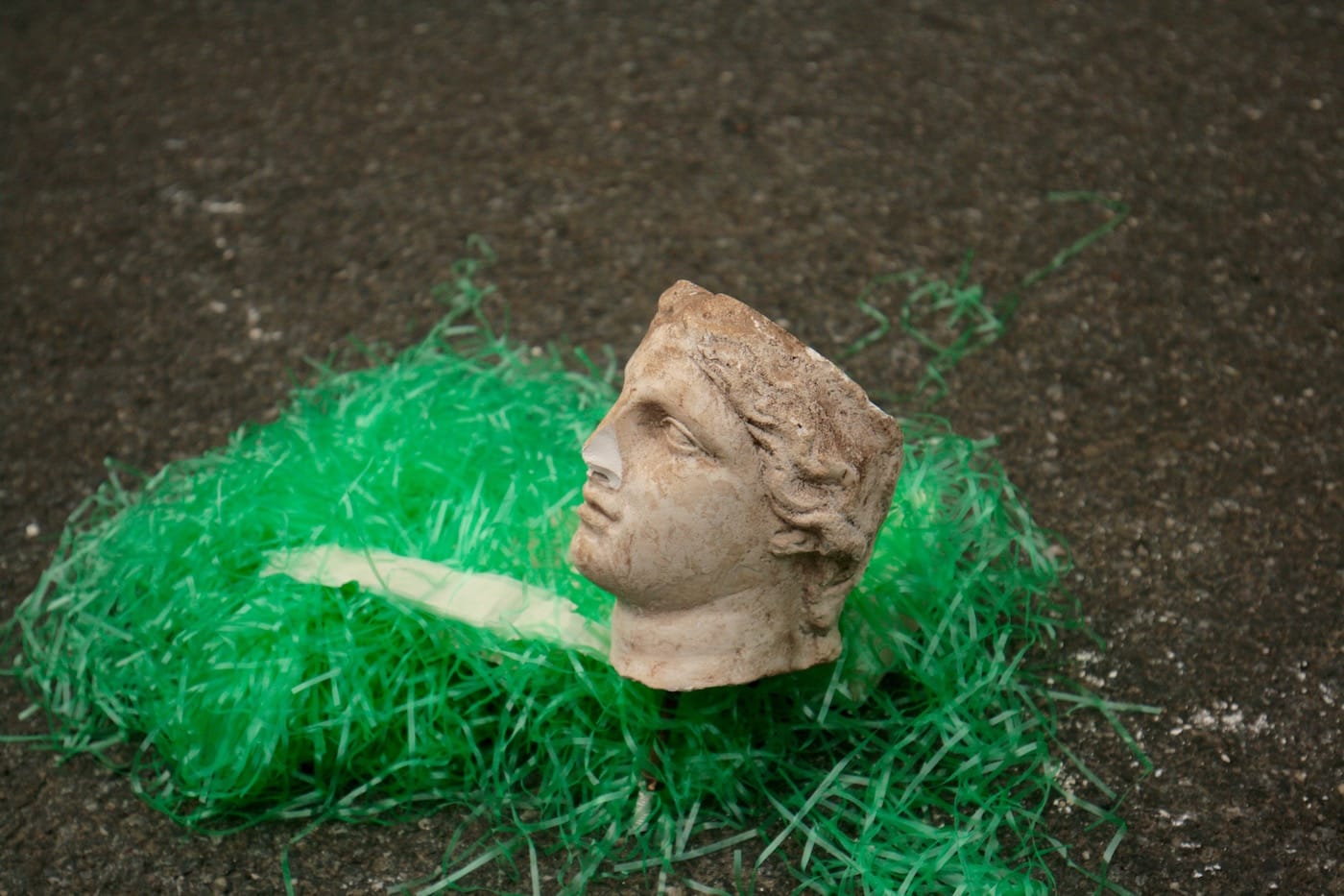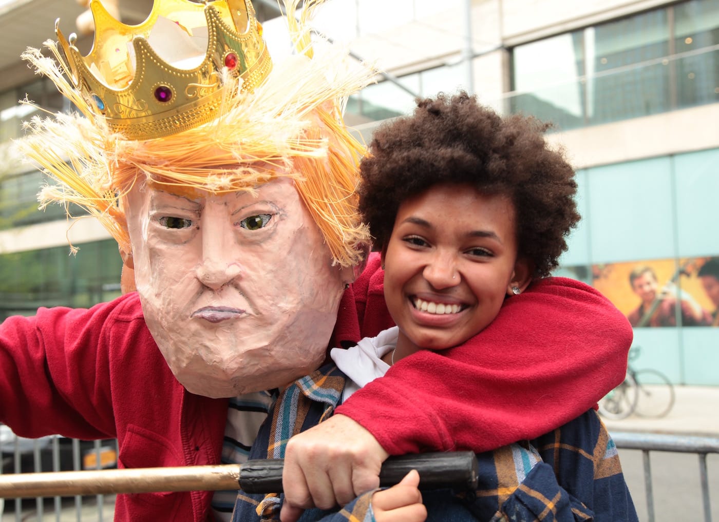 Despite her contention that organization isn’t her style, Sundara managed to secure a pretty prime piece of New York real estate for Artists Rise Up, and art world real estate at that. Nearly half of the long block of 65th Street between Broadway and Amsterdam Avenue was gated for the event and about a dozen police monitor happenings. About twice as many artists occupied a space in front of Lincoln Center’s Elinor Bunin Munroe Film Center. The artists were fellow LaGuardia students, adults who found out about the event by searching Facebook for local Trump protests, and members of the activist group, Brooklyn Rebels, who showed up with homemade placards that read “Ask Me about #SavetheArts Postcard Protest” — a campaign involving artists making their own postcards in support of continued funding for the arts that are then sent to representative and senators. There was also Trump himself, in papier-mâché form. He wielded a golden golf club with one hand, using it to hit a classical bust that posed like a golf ball on Easter basket grass. With his other hand, he helped turn a spit, where a likeness of Big Bird was roasting.