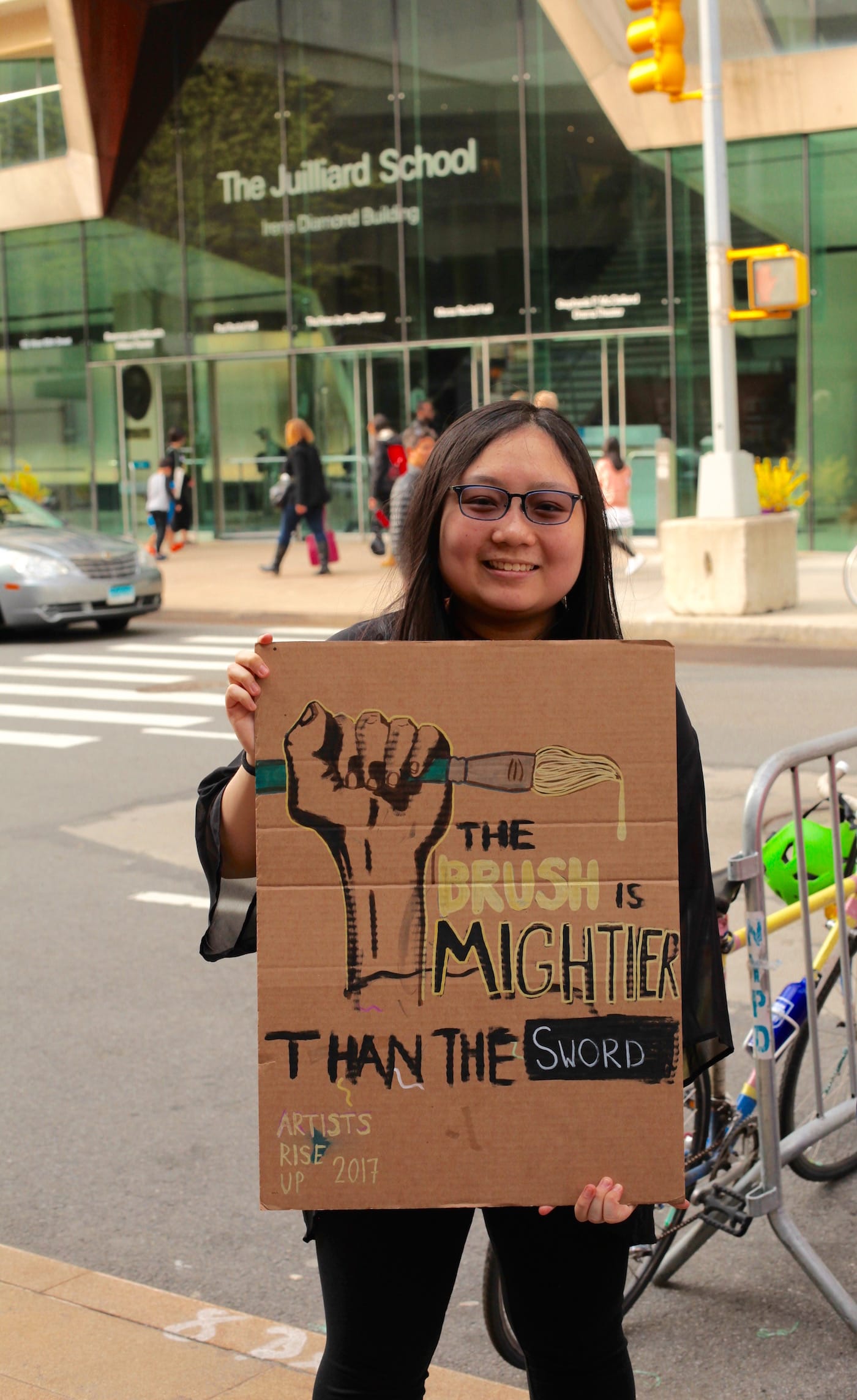 The fact that the hundreds who had RSVP’d for the event didn’t actually show up — there were only a couple dozen people — didn’t seem to bother the protestors present, or Sundara. Maggie, a senior at LaGuardia who preferred to not disclose her last name, held a hand-drawn cardboard sign that read “The Brush is Mightier Than the Sword,” and said that everyone who showed up was committed to making an important point. “Artists are like politicians in a sense,” she said, “we’re just not well-paid. But we make statements and we get messages out, and we don’t have to go through Congress to do it. We get the word out faster.” Maggie surmised that Trump “maybe didn’t grow up with art” and that his effort to “make everyone uniform” is an insult, especially to artists and their individuality.