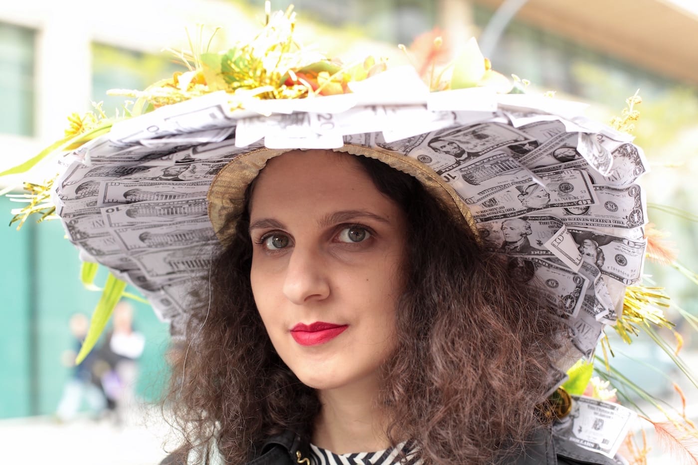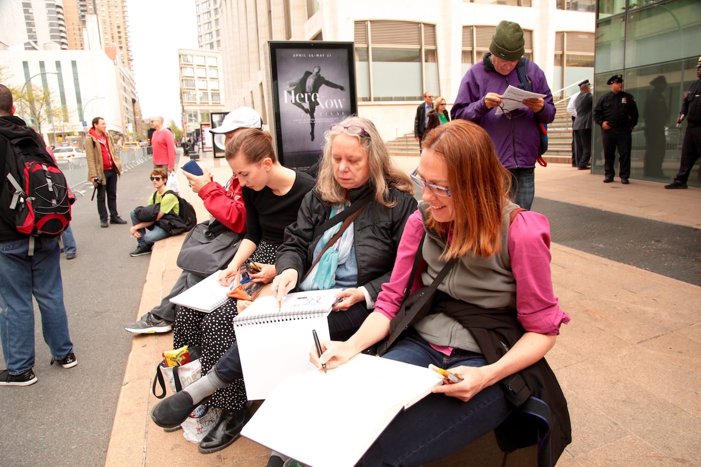 But whether the word was actually getting out wasn’t clear. Among the few protestors, a small handful held signs and one was engaged in a performance piece, wearing a homemade hat pasted with fake money and handing out play cash. A few passersby asked me what was going on, curious enough to ask and satisfy their desire to know, but not enough to stick around or join in. Well-dressed movie- and theater-goers, many carrying bouquets of flowers, strolled past on their way to a Lincoln Center event, paying little mind to the quiet group of artists.