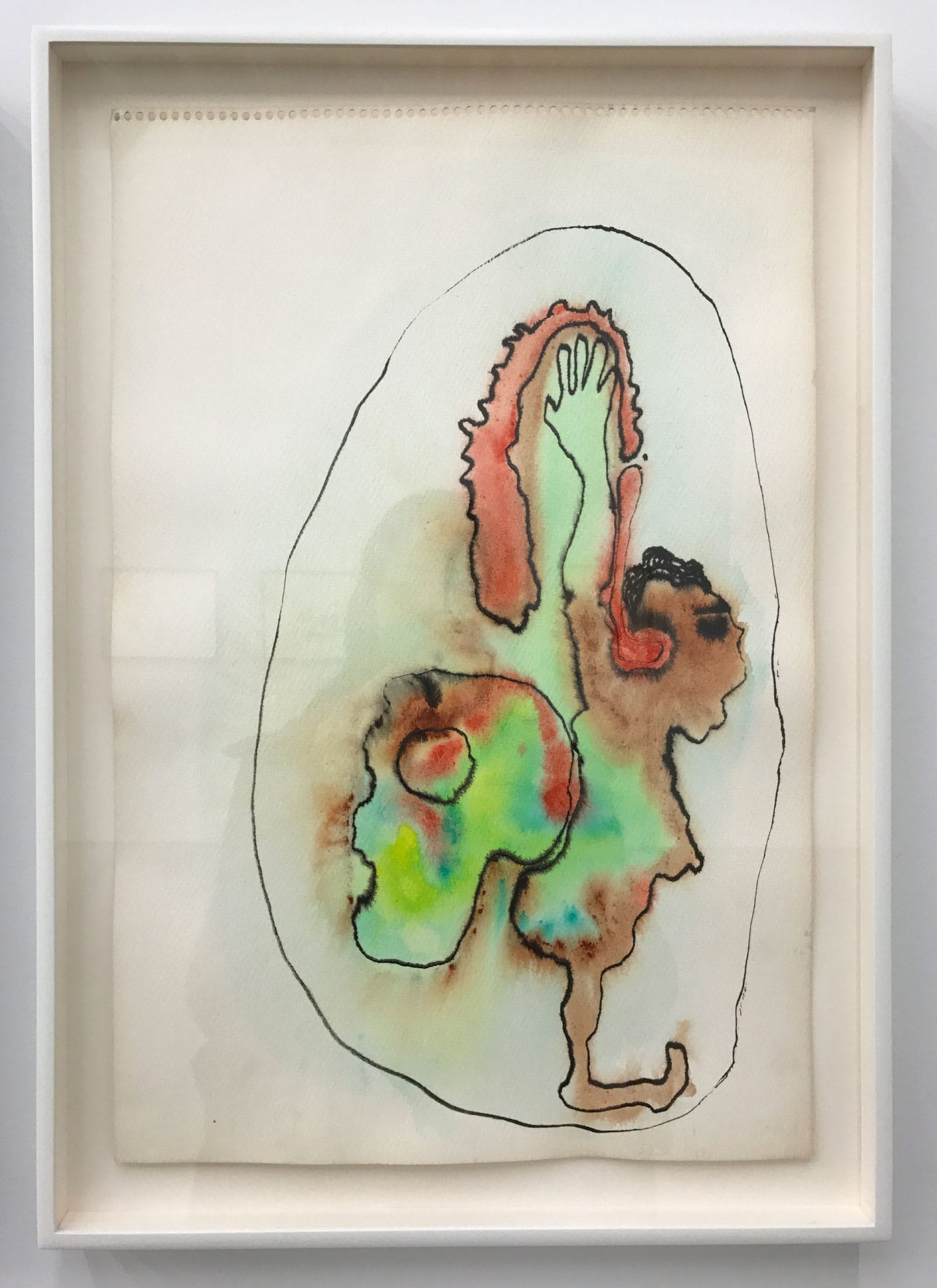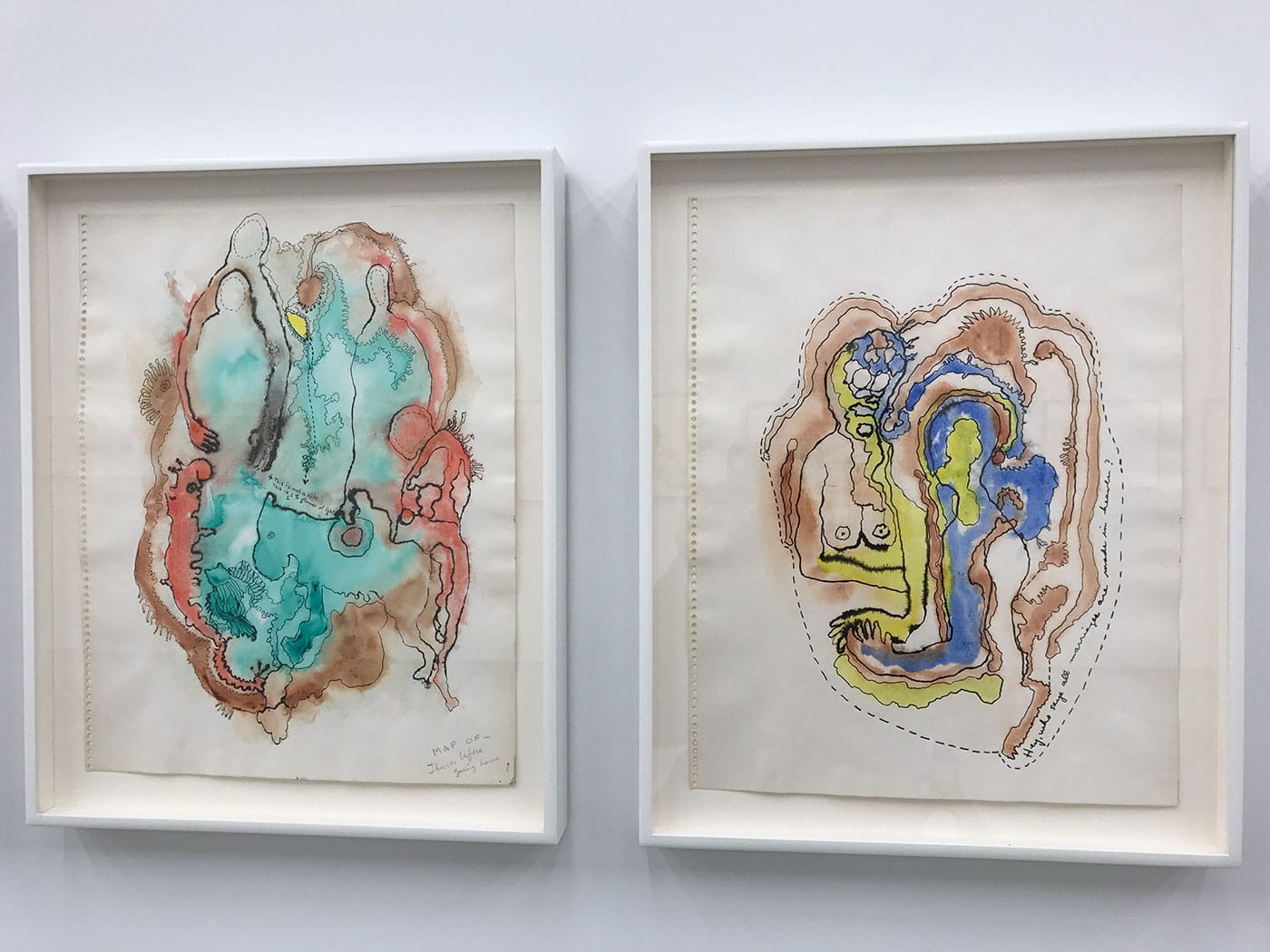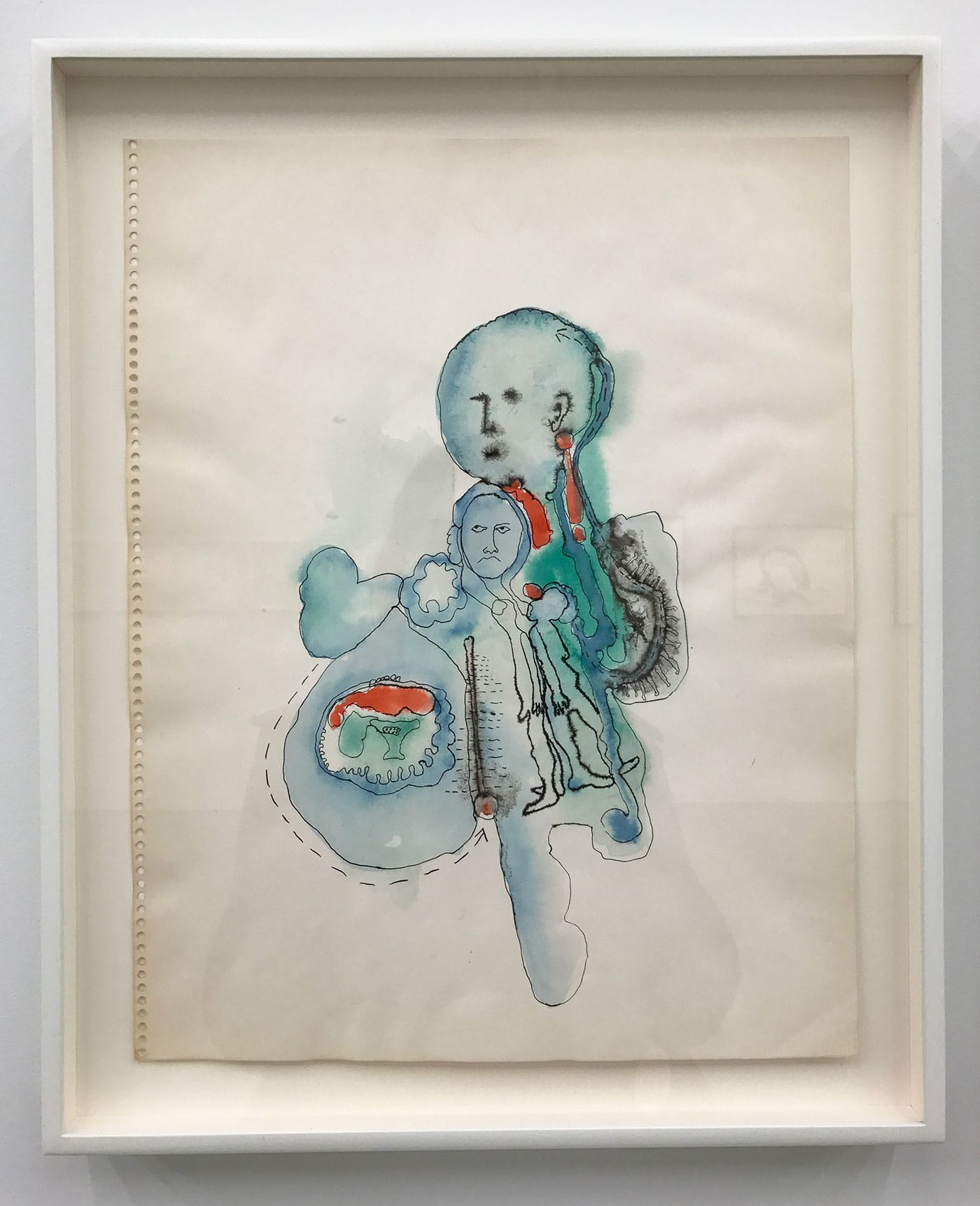 The Mercy Hospital drawings feature biomorphic blobs, often in color, with lumpy bodies and body parts locked within them — a face here, breasts there, hands and feet and sometimes animals or menacing creatures. One gets the sense of a person caught in the grips of depression, pulled between her grounded, physical self and an unmoored psychic volatility. The circles and other globular forms recall cells, and the squiggles some kind of brain matter, with the dashed lines that often envelop these shapes standing in as membranes. But there’s another metaphor at work as well. One splotchy, black-and-white drawing shows a pair of women’s bodies with small, dashed-line rectangles appended to them: the tabs used to adhere clothing to paper dolls. The mix-and-match bodies are sandwiched between three men’s heads in profile, suggesting Freud and other male torchbearers in a field with a history of judging women’s emotional states and subjugating their bodies.