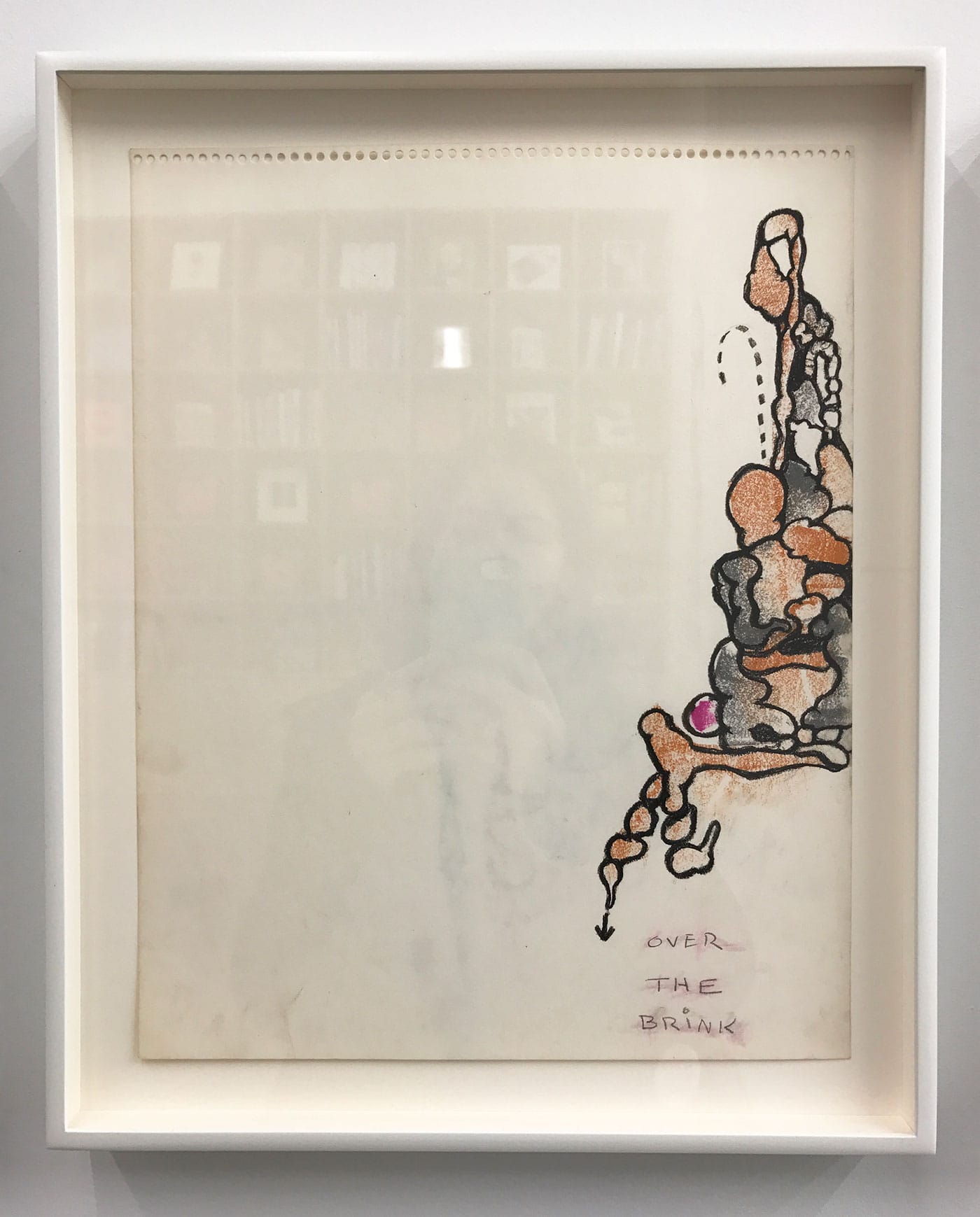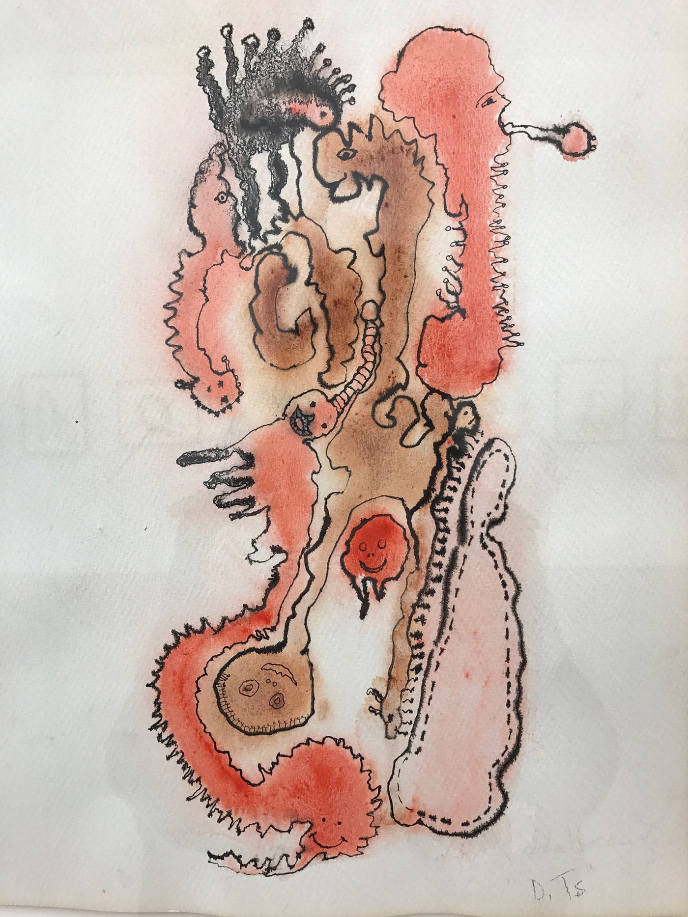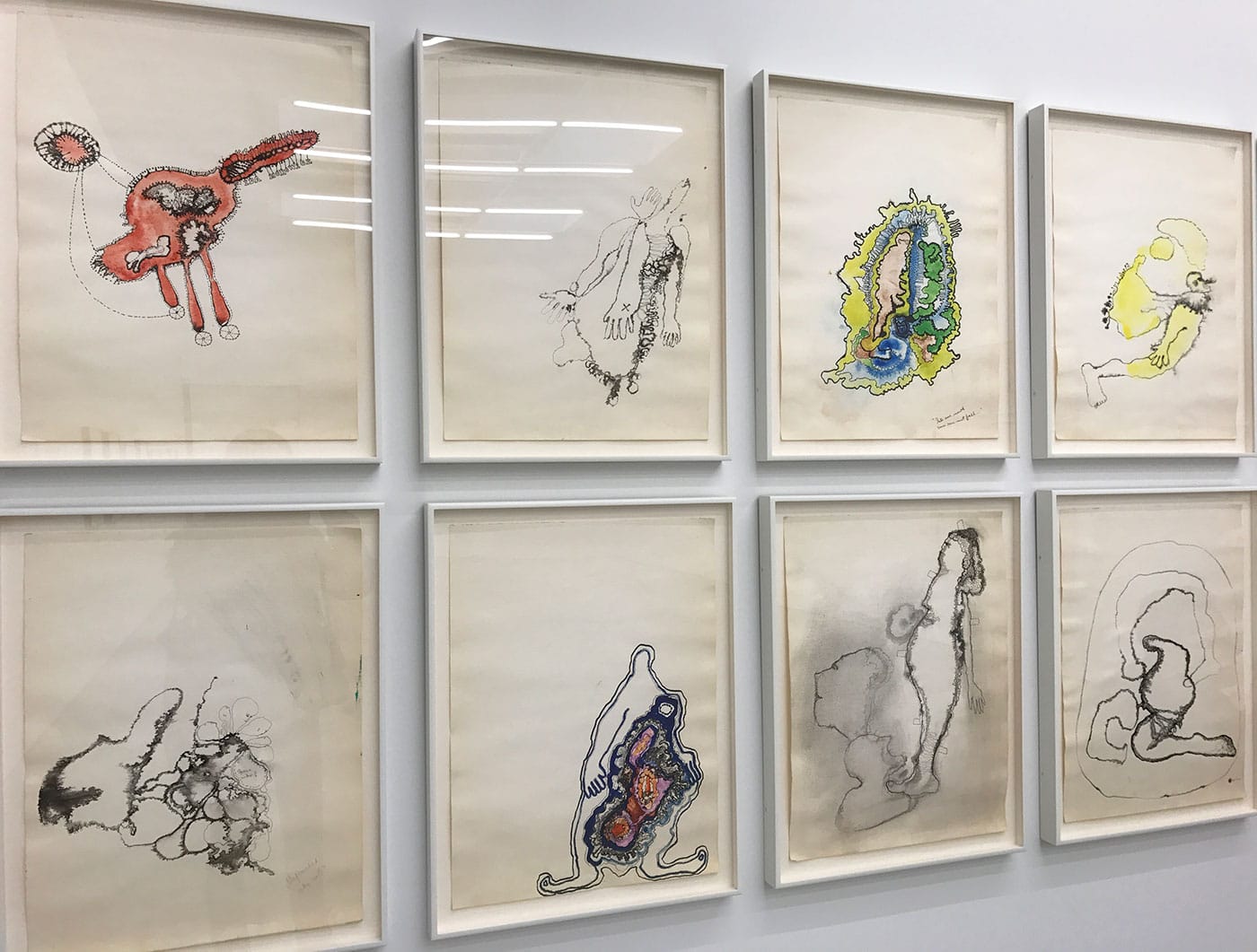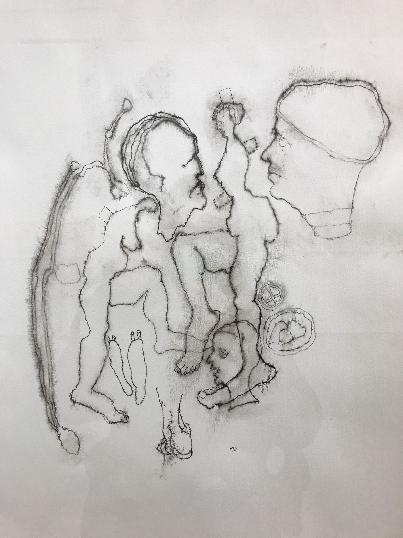 The Mercy Hospital drawings feature biomorphic blobs, often in color, with lumpy bodies and body parts locked within them — a face here, breasts there, hands and feet and sometimes animals or menacing creatures. One gets the sense of a person caught in the grips of depression, pulled between her grounded, physical self and an unmoored psychic volatility. The circles and other globular forms recall cells, and the squiggles some kind of brain matter, with the dashed lines that often envelop these shapes standing in as membranes. But there’s another metaphor at work as well. One splotchy, black-and-white drawing shows a pair of women’s bodies with small, dashed-line rectangles appended to them: the tabs used to adhere clothing to paper dolls. The mix-and-match bodies are sandwiched between three men’s heads in profile, suggesting Freud and other male torchbearers in a field with a history of judging women’s emotional states and subjugating their bodies.
