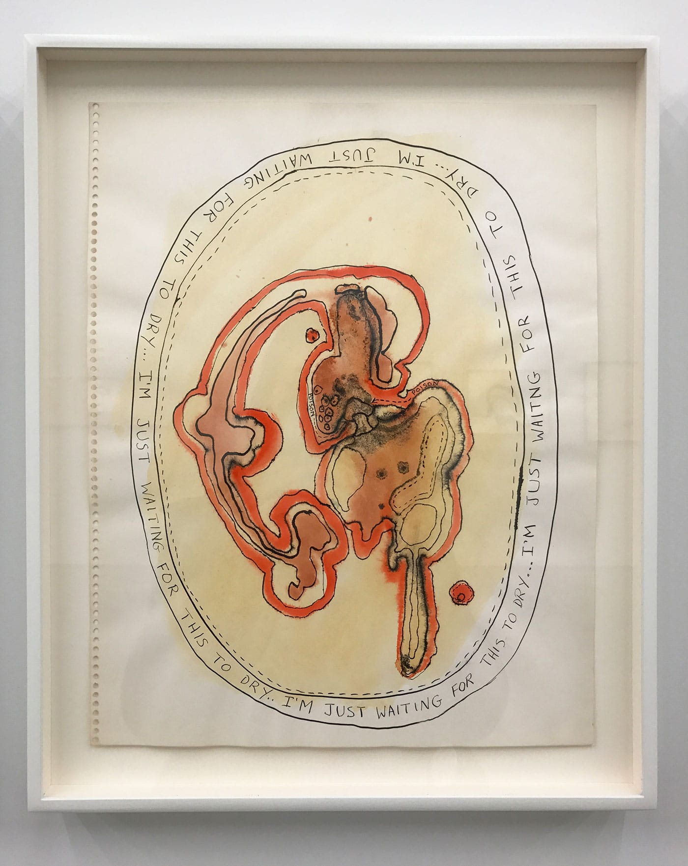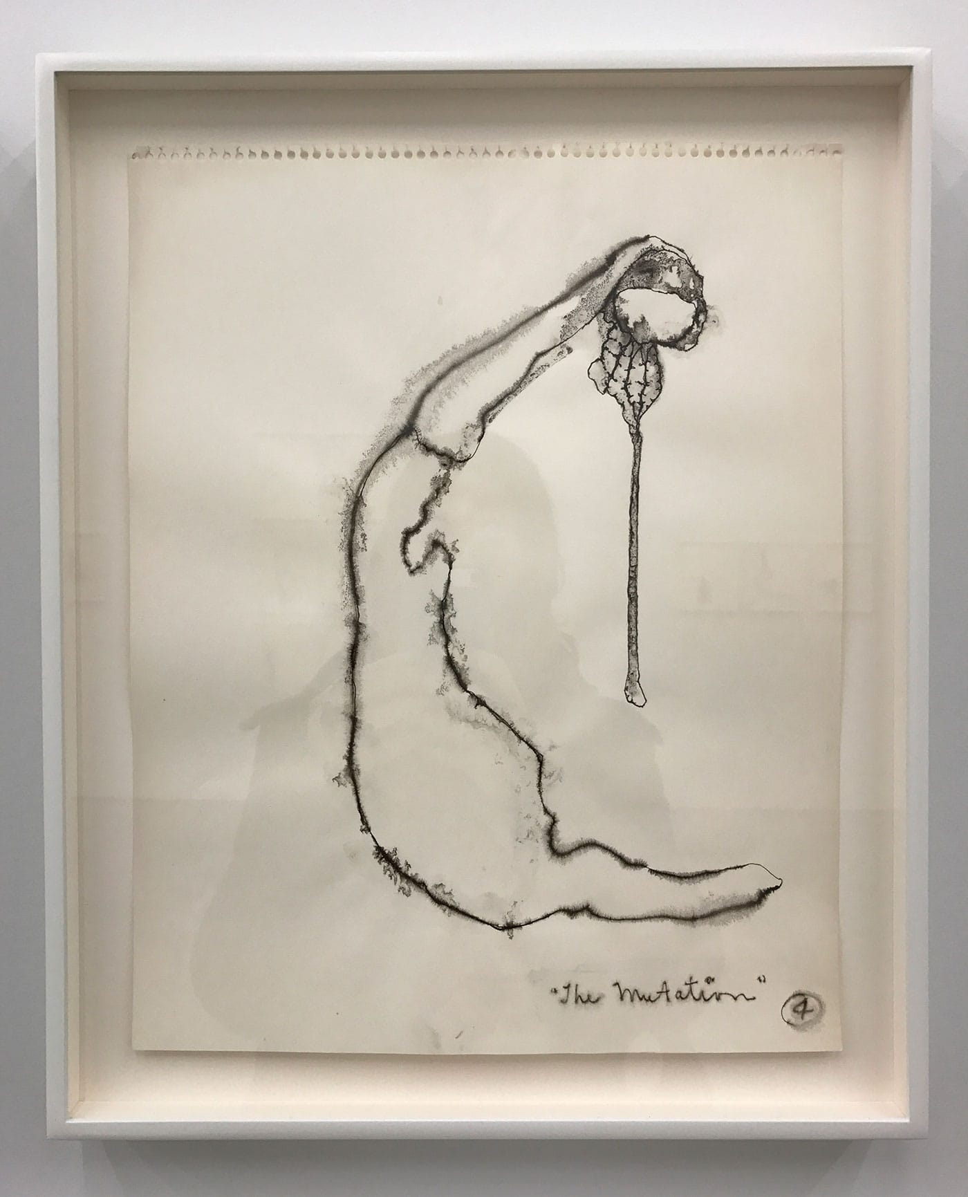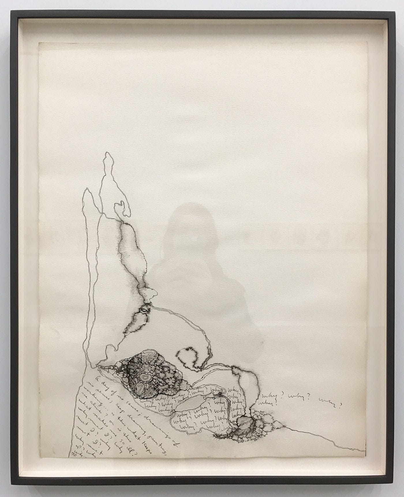Many of the works forego text altogether, but in those that contain it, it usually functions in this way, as a kind of deadpan punctuation. In one drawing, however, Applebroog seems to treat the text almost as a diary entry. The bare image features a triangular form that could just as easily be a mountain as a misshapen body, with a bubble embedded in the base, containing small cells and the letters I-D-A. Emerging from that are a series of “why?”s, painstakingly repeated and progressing toward the edge of the page. In the bottom left corner of the shape, a text unfolds in another triangle: “A day of no sense; drawings of no sense; keep drawing, painting, working … is this what keeps me alive? or is this what makes me so ill? why must I? why must I? why must I? why must I? why why … ” Standing in the gallery before a work throbbing with so much ache, I was struck by the glimpse of a hopeful possibility: maybe it was the art that kept her alive.
