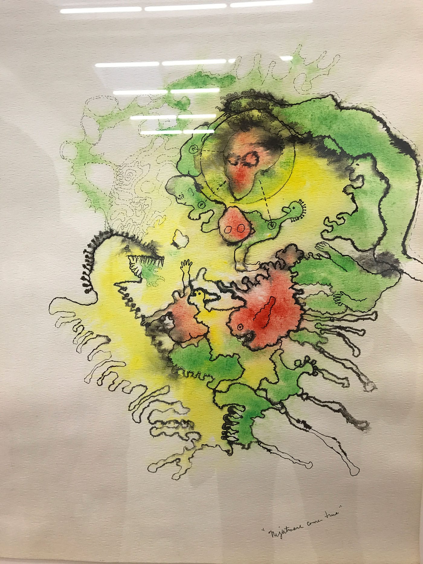 While the imagery in Applebroog’s drawings is multifold, the text is almost agonizingly direct. “Over the Brink” reads one inscription below a pile of what look like stones about to fall; “The Mutation,” says another, below a faceless creature whose one leg and arm form a lumpy crescent; yet another drawing, which shows maniacally grinning creatures emerging from a swirl of inky black lines and color, is captioned, simply, “Nightmare come true.” Applebroog’s dark phrases seem to buttress her flickering visuals, even as her unstable images belie the matter-of-factness of her words.