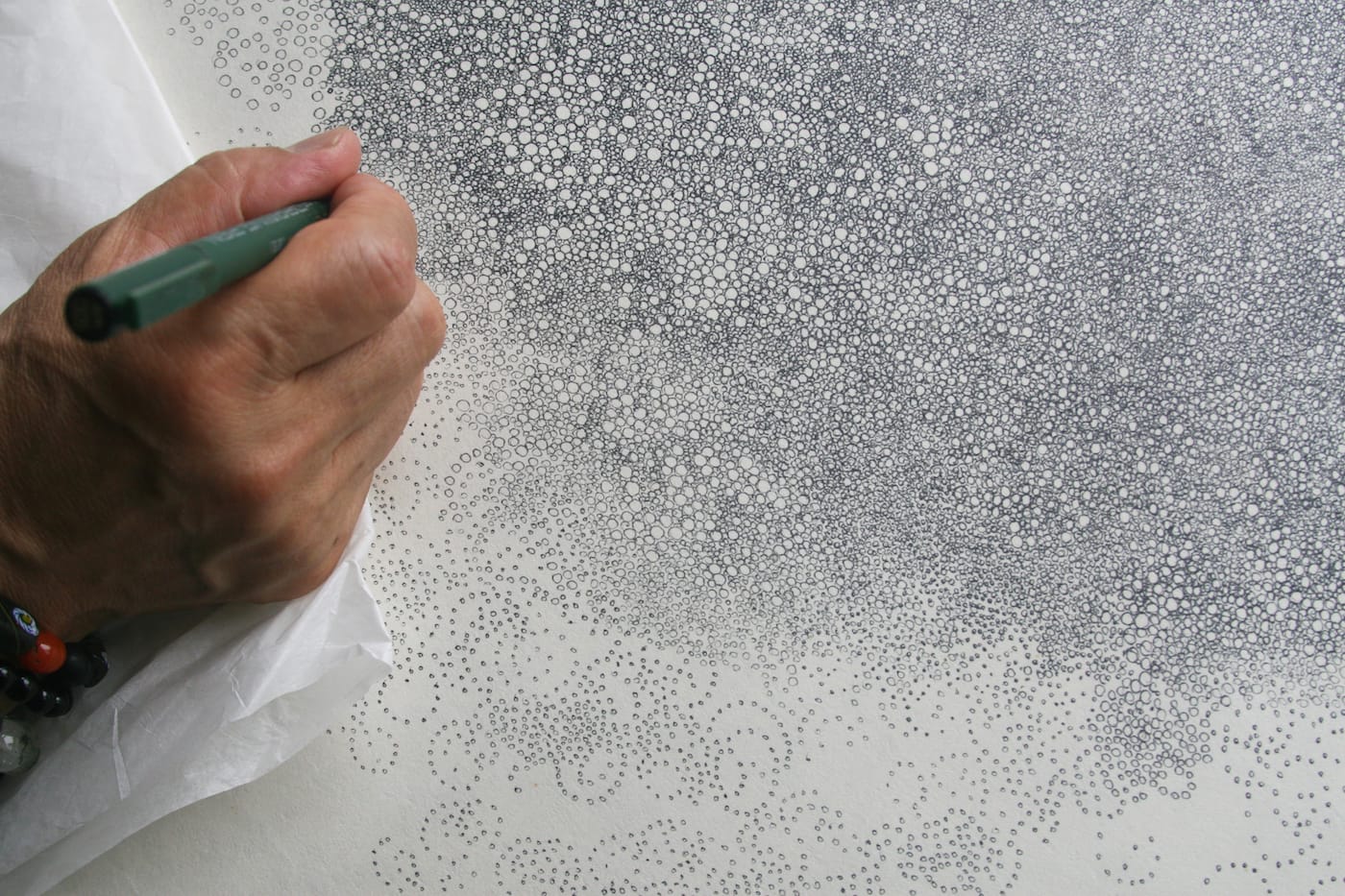 Detail of one the artist Hiroyuki Doi’s drawings-in-progress, showing the tiny circles of which his images are composed (photo by the author for Hyperallergic)