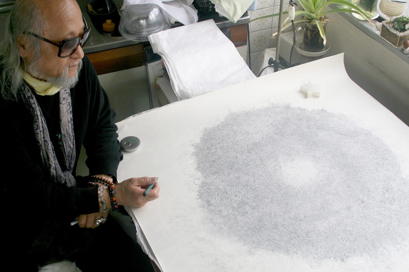 The artist Hiroyuki Doi at work on one of his circle-based drawings in his studio in Tokyo (photo by the author for Hyperallergic)