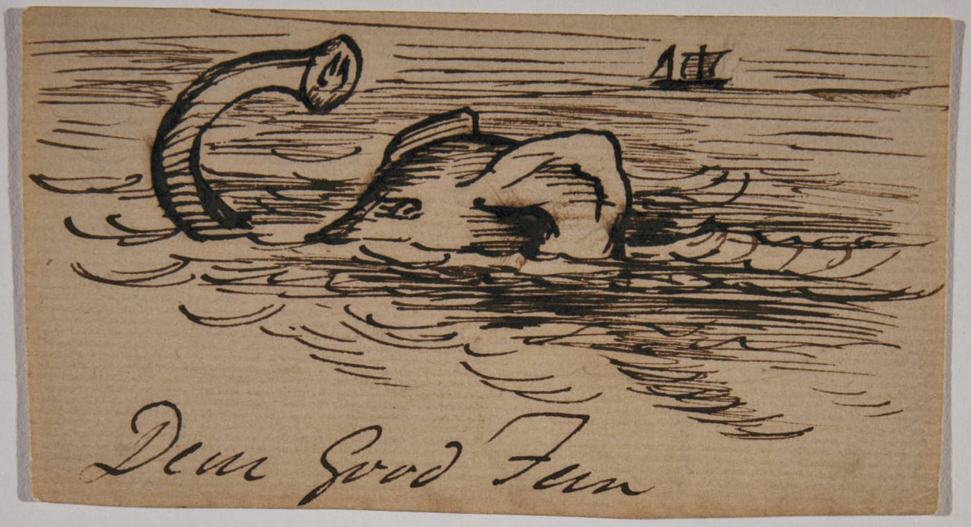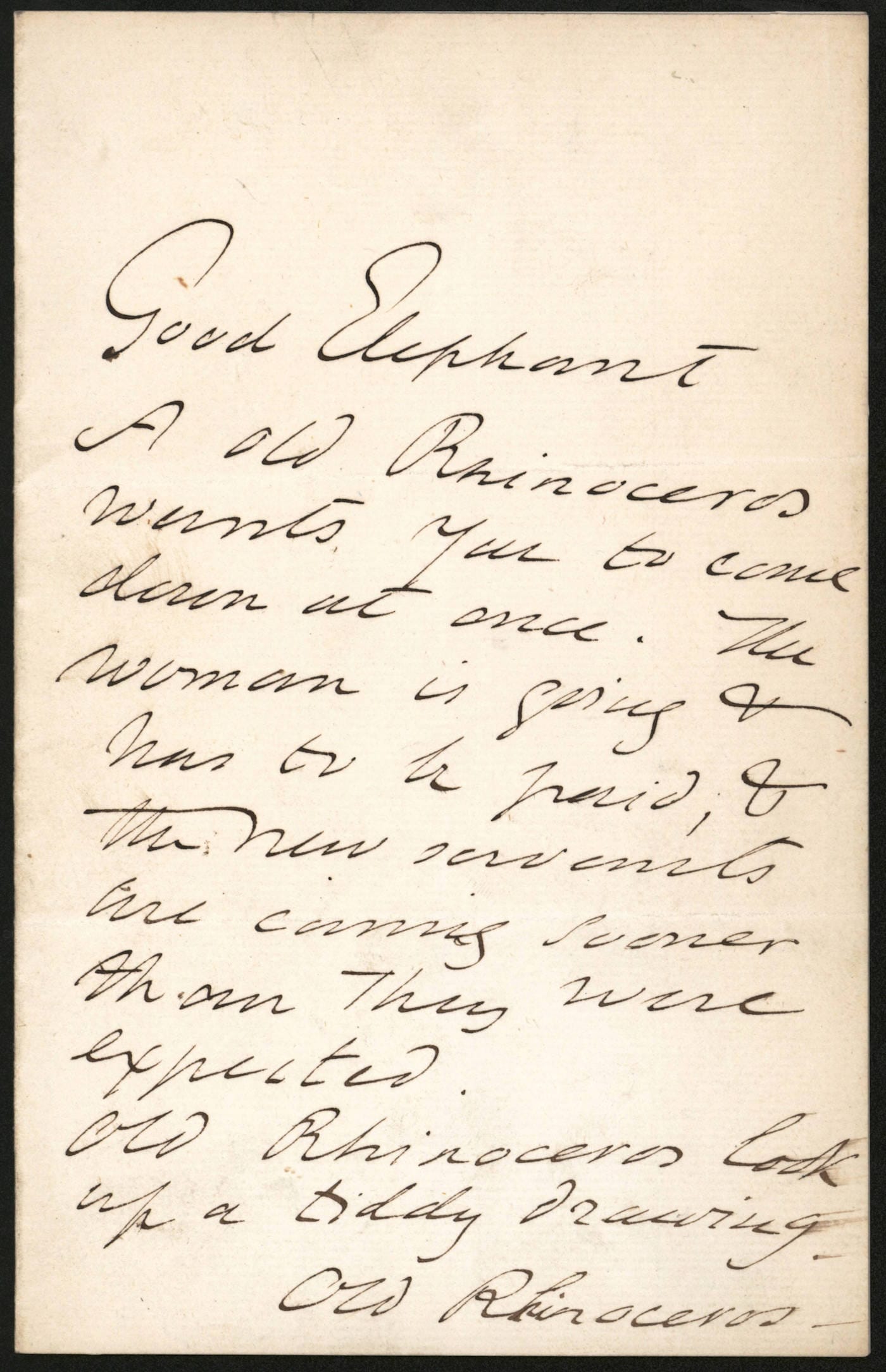 One of those visits was from Azelina Flint, a PhD candidate in the School of American Studies at the University of East Anglia in the UK. In a March blog post, she described her project of digitizing DAM’s hundreds of letters and poetry manuscripts by Rossetti, including the materials related to Cornforth. Collector Samuel Bancroft, Jr., was an American textile manufacturer who acquired Pre-Raphaelite art, and also communicated with Cornforth. Flint notes that the DAM archives include a letter from Rossetti’s brother dismissing Cornforth’s interest in attending the painter’s funeral and intimate exchanges that reveal a relationship that evolved, over more than two decades, from affairs to a real friendship. Some of Rossetti’s correspondence is addressed “My Dear Elephant” (or features elephant illustrations), while she in turn anointed him “Rhinoceros,” a shared teasing about their growing older.