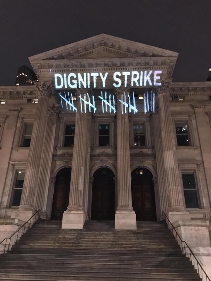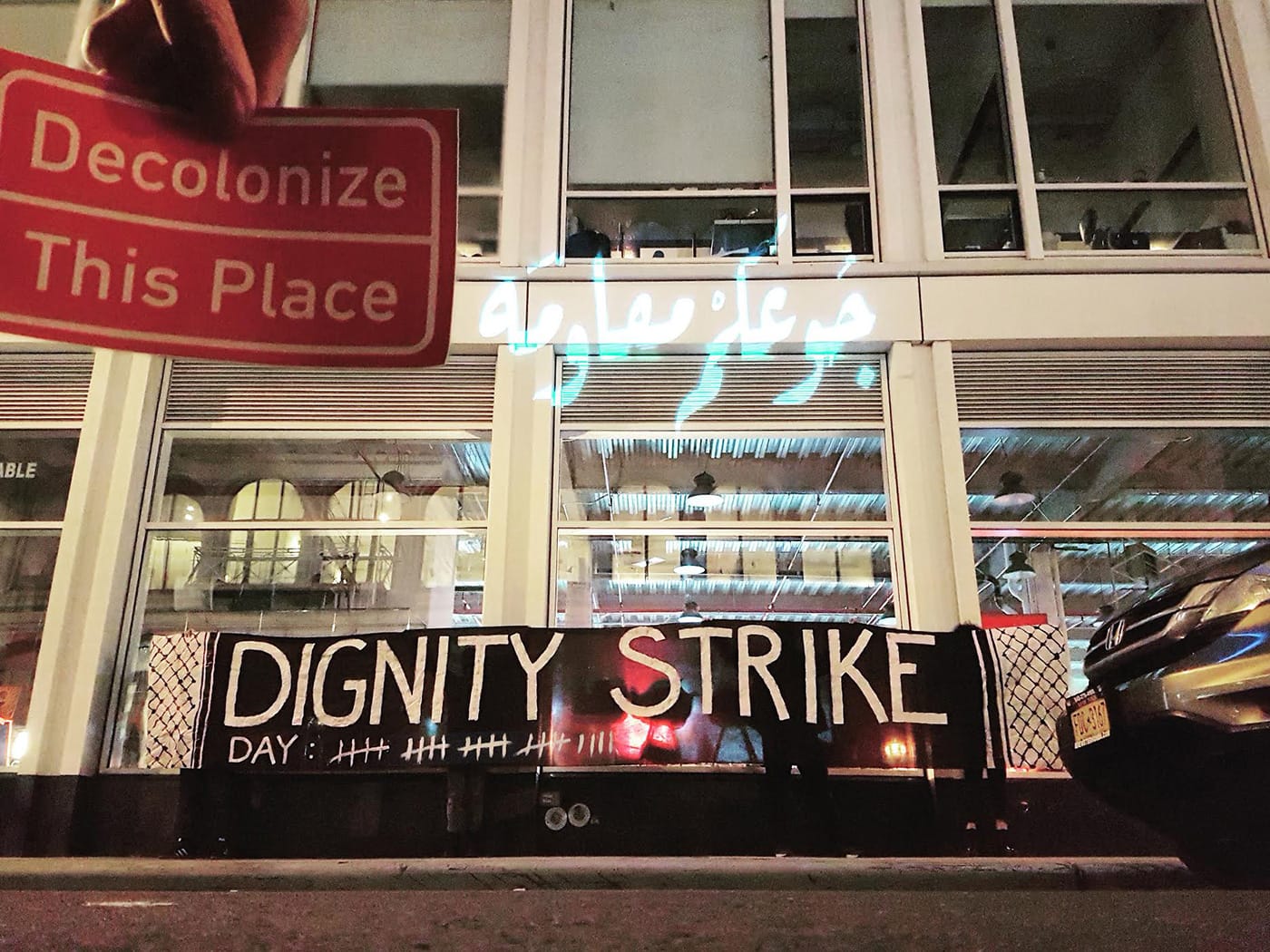 This was but one connection between the #dignitystrike projections and the broader network of artists and organizers that developed under the rubric of Decolonize This Place over the past year, including the three-month residency at the alternative arts venue Artists Space last fall. More than a show of political art, Decolonize this Place transformed the gallery into a round-the-clock movement hub facilitating linkages between struggles including de-gentrification, global wage workers, Black liberation, Standing Rock, Puerto Rican debt-resistance, and Free Palestine, among others. Palestine has been essential part of the work of Decolonize This Place. As Kyle Goen — an artist involved in creating much of the graphic repertoire for the project — explains, “Far from an isolated and remote struggle, the occupation of Palestine and the movement against it bears deep affinities with decolonial movements in the United States, from the water protectors of Standing Rock to the anti-displacement activists in Bronx.” These were among the places that were name-checked in the projections on Tuesday night, reminding us that the grammatical shifter “this” in “Decolonize This Place” is an mobile imperative linking together different sites and histories depending on where it is uttered.