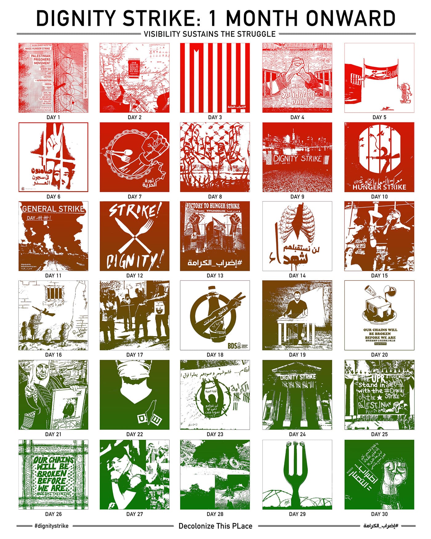 In each of its iterations, the tally-marks were supplemented with the phrase “Dignity Strike,” which has also been the primary hashtag of the Visibility Sustains the Struggle initiative. As artist and organizer Amin Husain explains, “Hunger strike is the tactic and the immediate demands concerning the conditions of the prisoners are quite precise; but the prisoners movement has continuously emphasized that it is dignity and freedom of all Palestinians that are at stake. This strike has broad ramifications at a moment when Oslo and the two-state solution are dead, the resistance is jailed, neoliberalism runs rampant, and the PA is a petty-bourgeois adjunct to the occupation in the manner identified by Frantz Fanon long ago. Israel is intent on showing that resistance is futile, that Palestinians must roll over and accept their fate. The prisoners and their bodies are at the threshold of this attack on the Palestinian capacity to resist at all.”