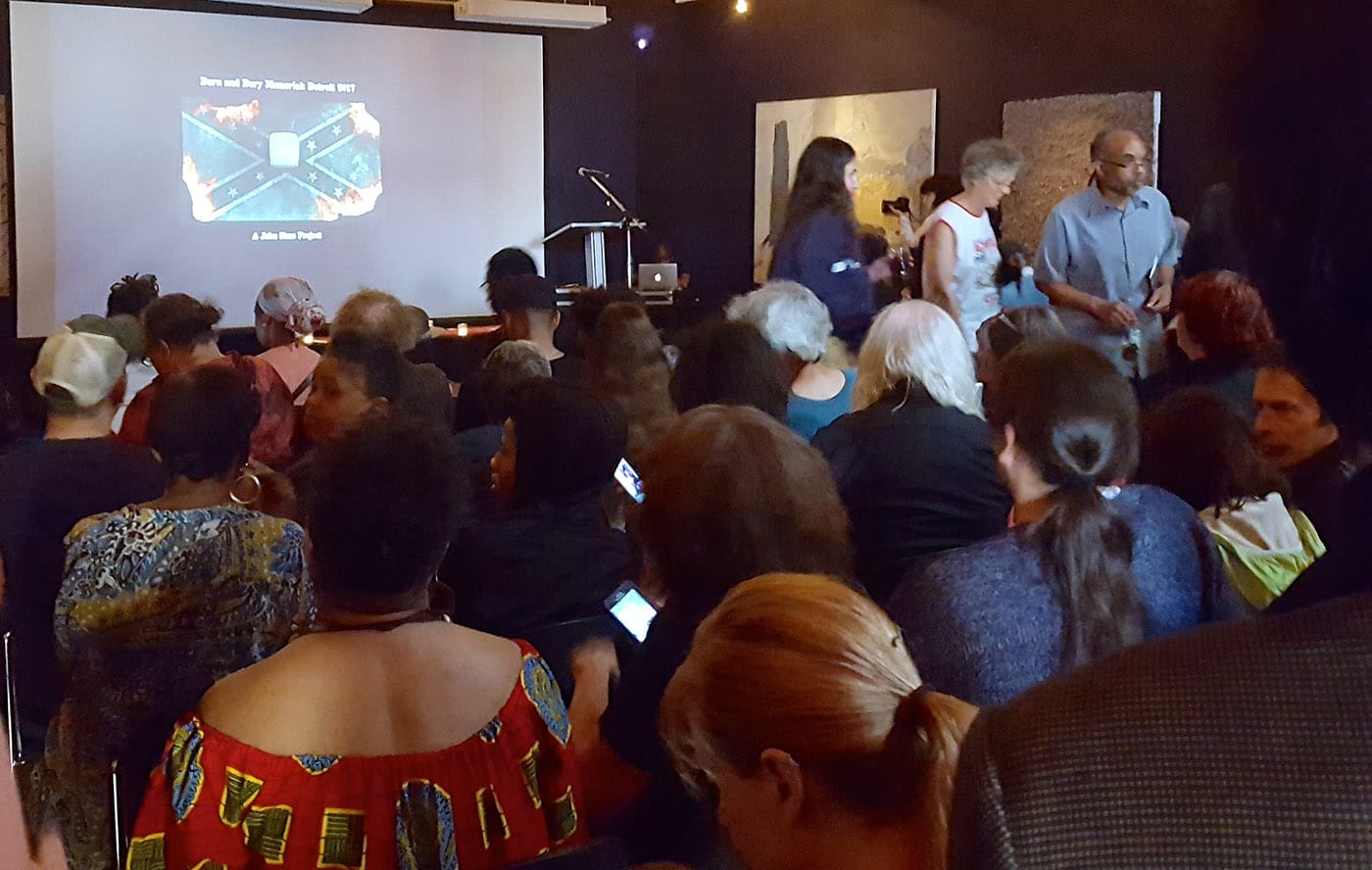 “We deal with white supremacy every day,” said Care Moore, before performing a poem that included her reflection on the 9/11 attack on the Twin Towers. “We deal with white supremacy, especially in Detroit. There’s a takeover happening right now. When people can have openings of new hotels, and there are 10 black people out of 500.” Her commentary was met with claps and cheers of assent from the crowd, which packed the space to standing room only throughout the two-hour ceremony. “Will we finally become equal under shared oppression?” she asked in her poem, continuing on to a litany of historical and contemporary abuses heaped upon marginalized communities the world over. “If it took the Twin Towers falling on your head to see white supremacy, then shame. On. You,” she concluded.