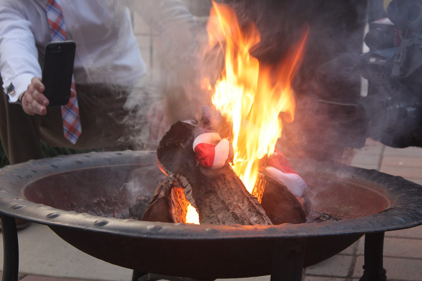 After roughly 90 minutes of performances, prayers, poems, and eulogies, the audience moved outside for the culmination of the event, the burning of the Confederate flag. By this point, the symbol had been thoroughly dragged, and the length of the ceremony had whipped some audience members into a frenzy and reduced others to a torpid state. Though the central act was the igniting of the full-size flag that had lain at the front of the room throughout the evening, small paper effigies were distributed to the attendees, who took turns tossing them into the fire. News cameras crowded in close to the conflagration to catch the money shot of burning flags.
