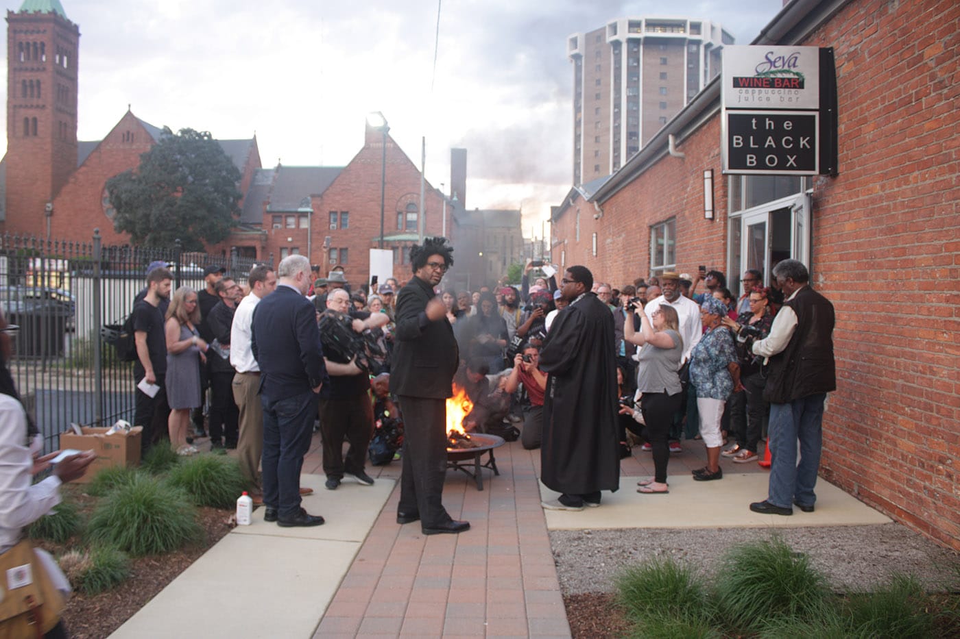 John Sims’s “Burn and Bury Memorial” took place at the N’Namdi Center for Contemporary Art (52 E Forest Ave, Detroit) on May 29. A video of the event can be seen here.