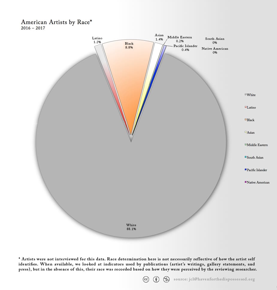 The researchers themselves warn that their data was compiled based on the perception of the researcher, and artists were not interviewed, so the stats are not completely reliable. Their website clarifies that “Gender and race determination is not representative of how that artist self-identifies. When available, we looked at indicators used by publications (artist’s writing, gallery statements, and press), but in the absence of this, race and gender were recorded based on how they were perceived by the reviewing researcher.”