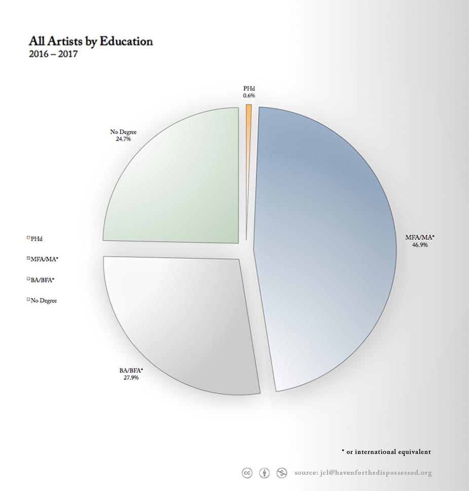 Other notable markers include education levels: 46.9% of artists have MFAs, while 24.7% have no formal post-secondary degree.