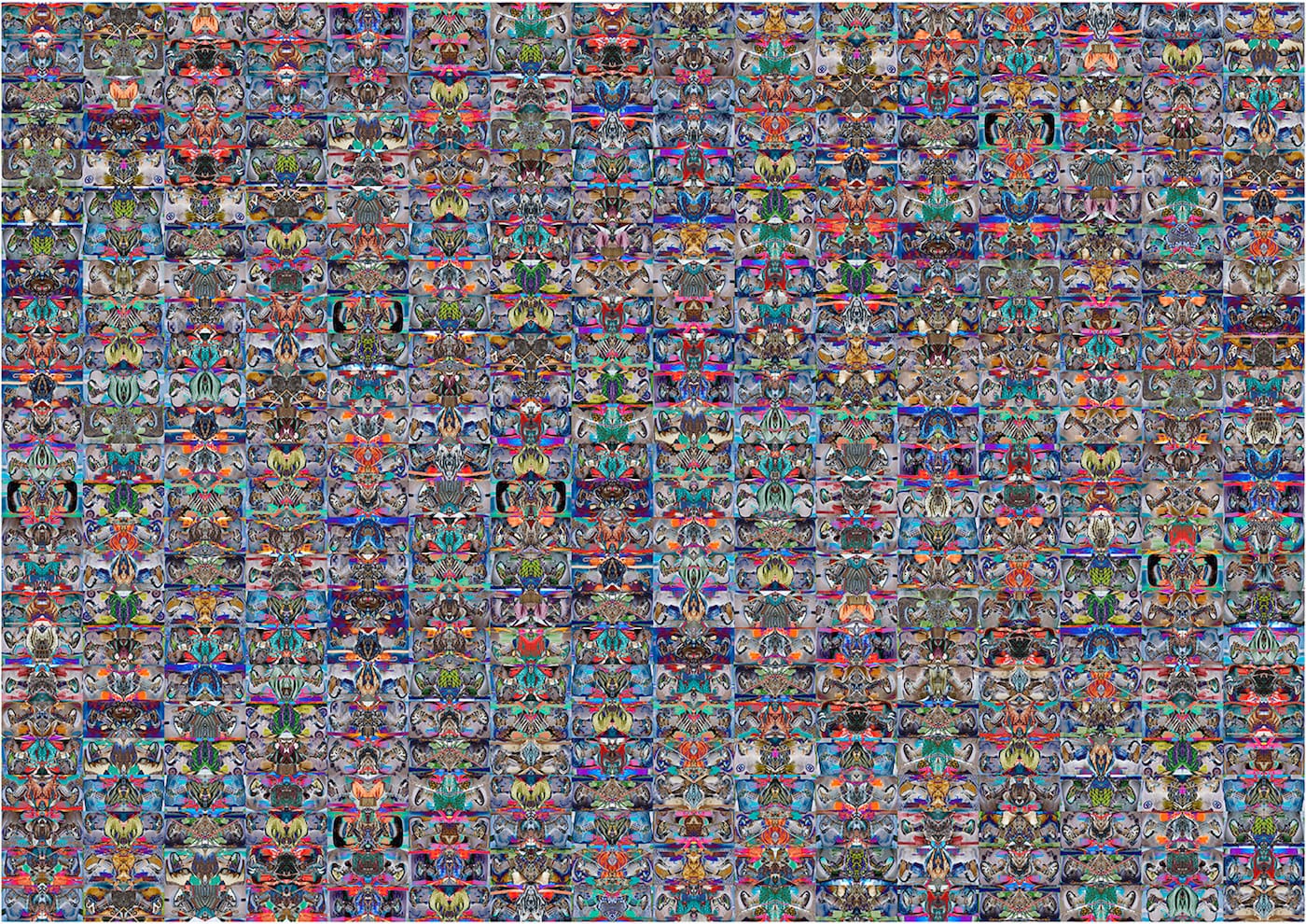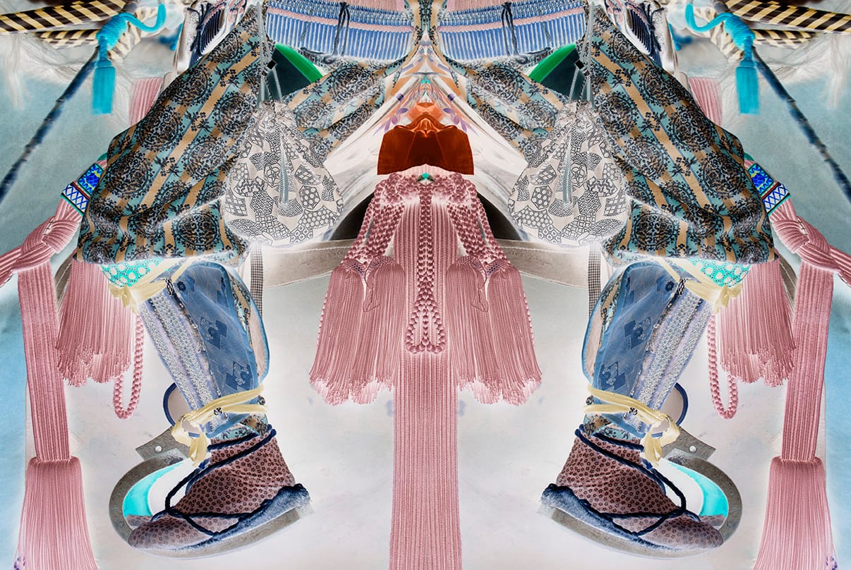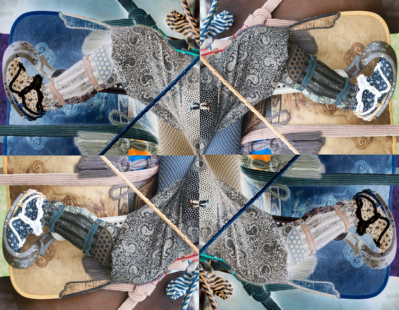 Other images included in the series more closely examine the elaborate patterns of the samurais’ clothing. As its title suggests, Brown viewed these textiles as fashion, noting that they feature a wide range of international motifs that stem from regions like China, India, Southeast Asia, the Middle East, and even East Africa. During Soma Nomaoi, he photographed these fabrics in color, honing in on their patterns and symbolic imagery, from carps to dragonflies. While his portraits were formal representations of the samurai, he digitally manipulated his textile studies, stitching them together so the final images are kaleidoscopic. These are dizzying visions, and some, with their colors greatly edited, are hardly recognizable as sections of samurai costume. The photographs resemble patterned textiles of Brown’s own creation; like his anachronistic portraits, they approach tradition from a fresh, unexpected perspective.