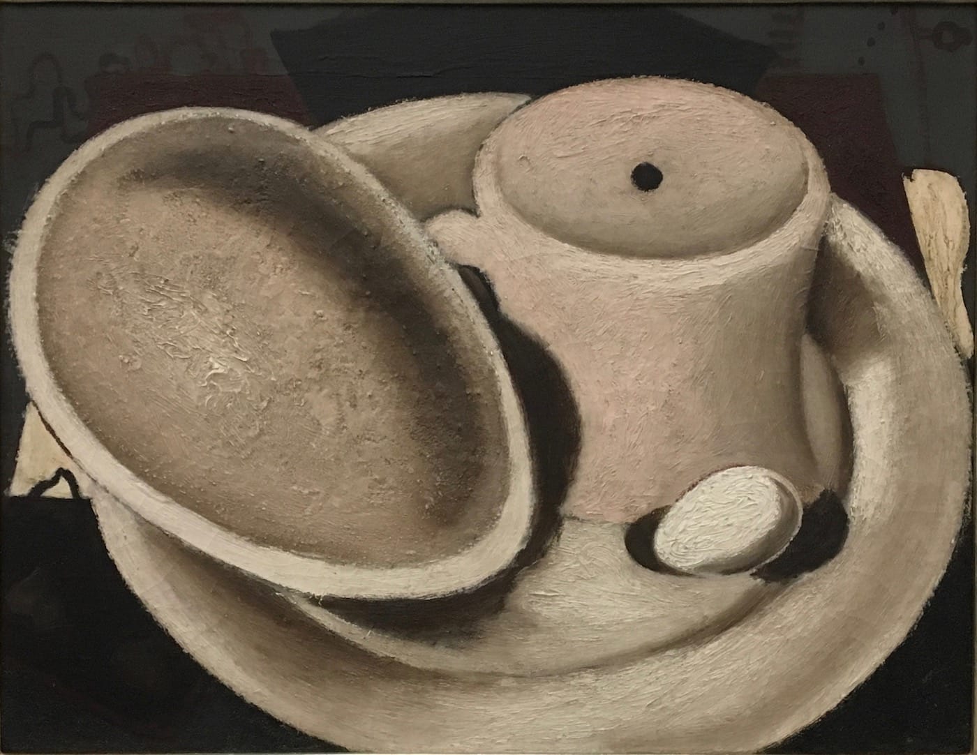 A canvas such as “Coffee Cup” (1928), is all earth tones and off-whites, with bluntly volumetric forms reminiscent of the back-to-basics Valori plastici group active in Italy at around the same time, as are a set of nudes painted the same year. But there is also a pastel-colored, Metaphysical-style “Interior” (ca.1928), à la de Chrico, that flaunts its deep perspectival space. A fanciful village-and-seascape, “Palermo” (1928), could have been painted by Maurice Utrillo.