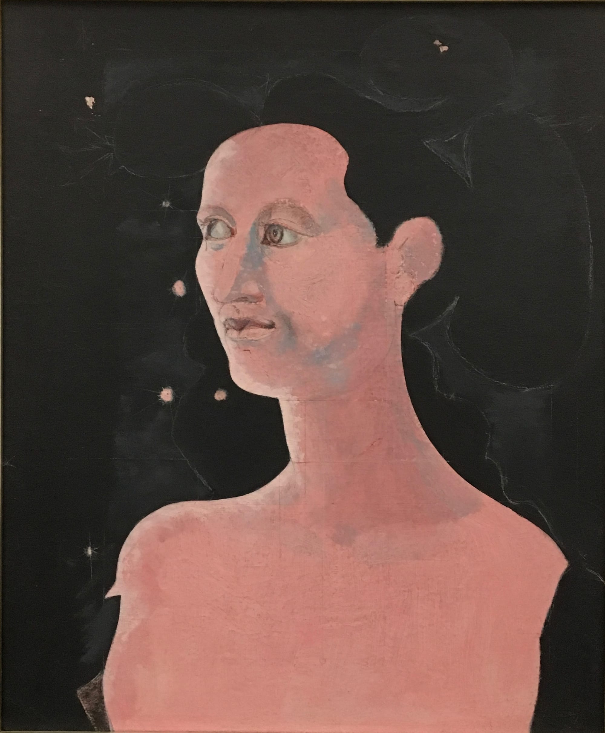 The first mature figurative works encountered in the exhibition are drawings hung across one side of a corridor dividing the rooms holding Graham’s early, scattershot experiments from a long, grand gallery displaying the more consistent and polished later paintings.