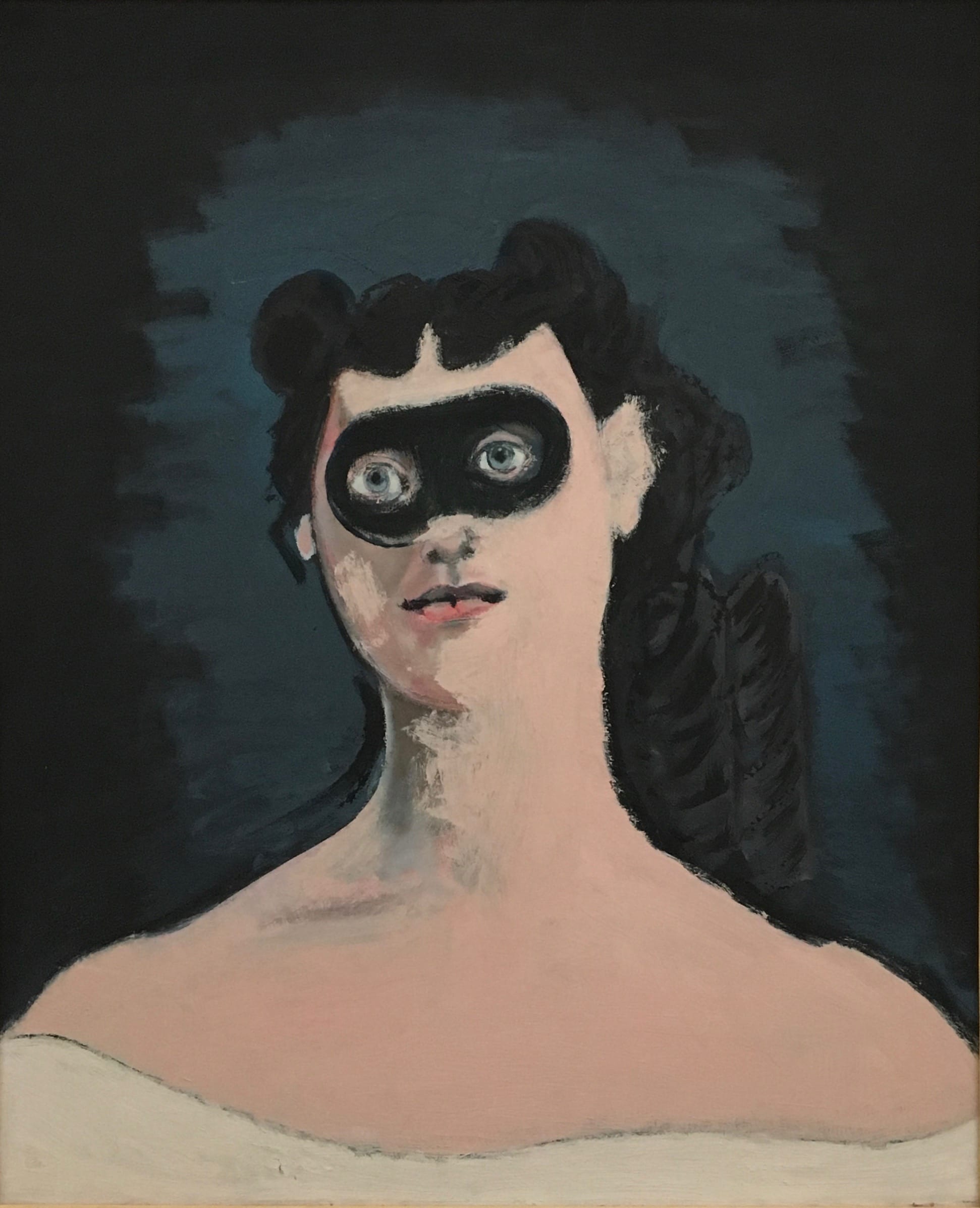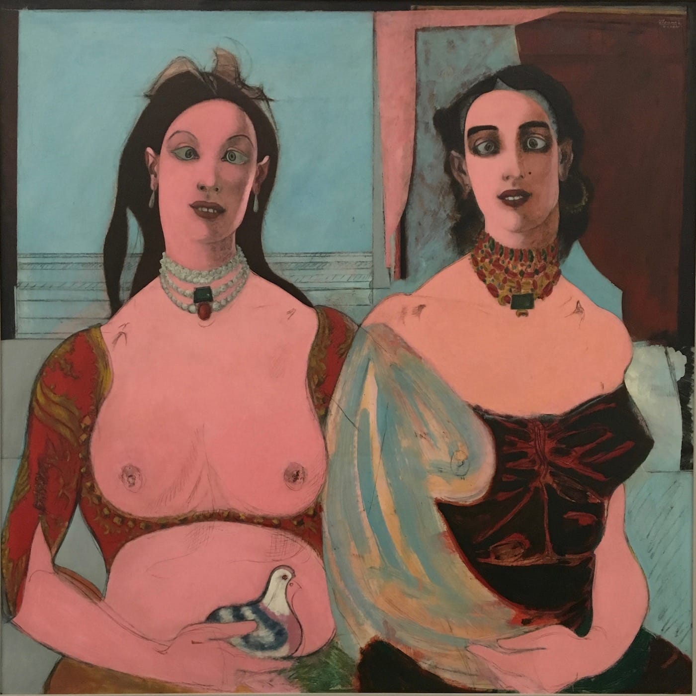 How else to explain our ease in accepting the bloody gash on the wrist of an otherwise classically serene portrait, or the black raccoon-eyes mask worn by the sitter in “Mascara” (1950)? Or the pronounced sexual undercurrent running through the double-portrait, “Two Sisters” (1944), from the collection of New York’s Museum of Modern Art, with its wickedly crossed eyes, bared breasts, and juiced-up color a blush shy of garish?