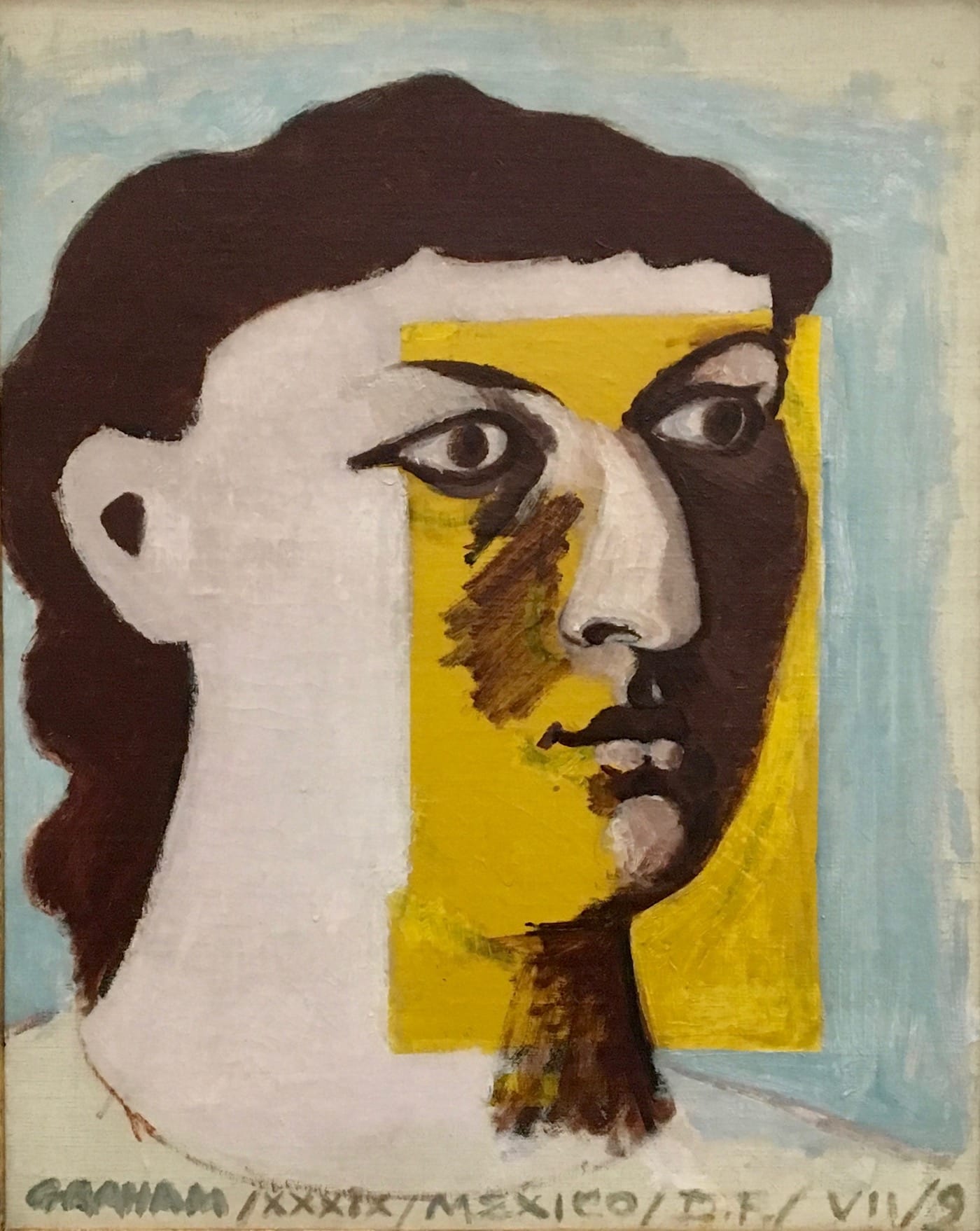 While some of his textural, white-on-white Cubist paintings from the following year are quite strong (“Still Life with Pipe” and “Peinture,” both 1929, and “Nature Morte,” 1929-1930), they barely deviate from Picasso’s style. As he enters the 1930s, Graham’s artistic output becomes, if anything, more transitional, with works like the solidly geometric abstraction “Red Square” (1934) — which is actually a red trapezoid — standing in direct opposition to an untitled, outsized Neoclassical head of Anni Albers from 1939. (The pairing of these two images on the same double-page spread in the catalogue seems like an inside joke about Albers’s husband, Josef, who would begin his famous Homage to the Square series ten years after Graham painted Anni’s portrait.)