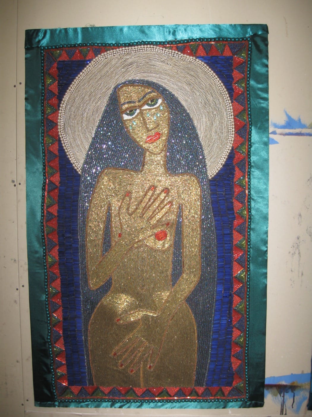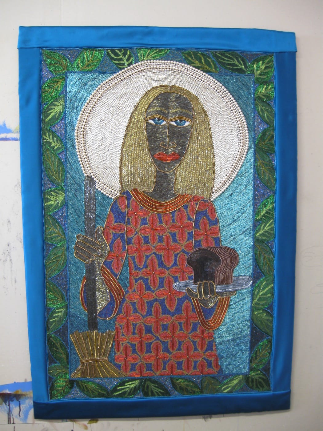 Among the works worth seeing was some beaded portraiture by Carri Skoczek, whose studio was at 1155 Manhattan Avenue. The artist showed me her assemblages of “St. Agatha” (2017), who, Skoczek says, is the patron saint of breasts, and “St. Zita” (2017), the patron saint of housekeeping and chocolate. (These are actual saints recognized by the Catholic church, though Skoczek took some liberties with her understanding of St. Agatha, who is more specifically portrayed as the patron saint of breast cancer.) There were even a broom and dustpan covered in chocolate and wax.