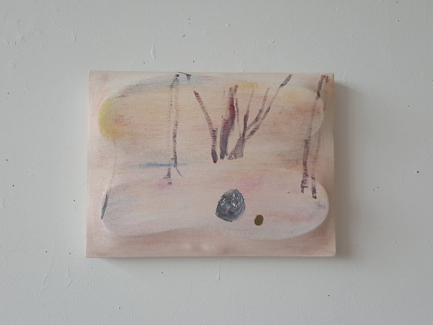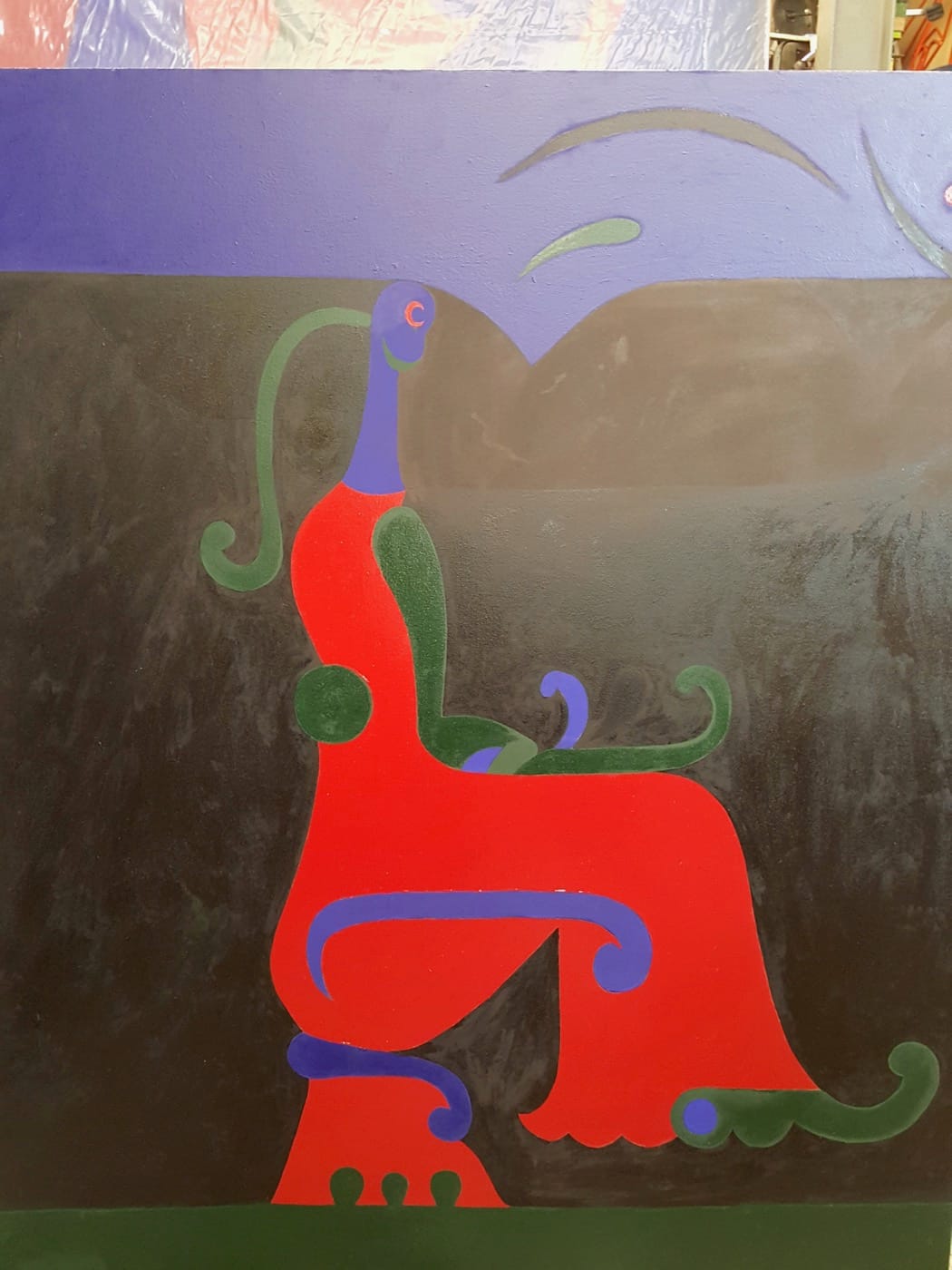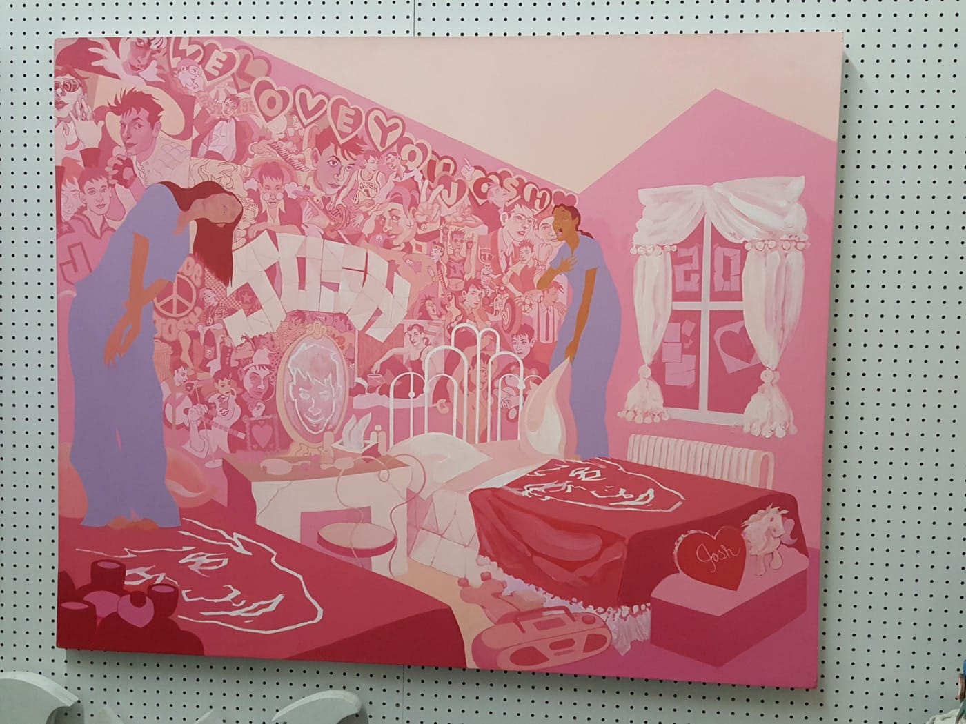 Ilse Murdock, at 236-250 Greenpoint Avenue, had her “I See” (2017) on display. This piece tucks debris and found shoes under a square of canvas, to which she has added some abstract washes of acrylic and oil paint, so that the impression of the shoes is clearly visible and the paint on top becomes a kind of marginalia.