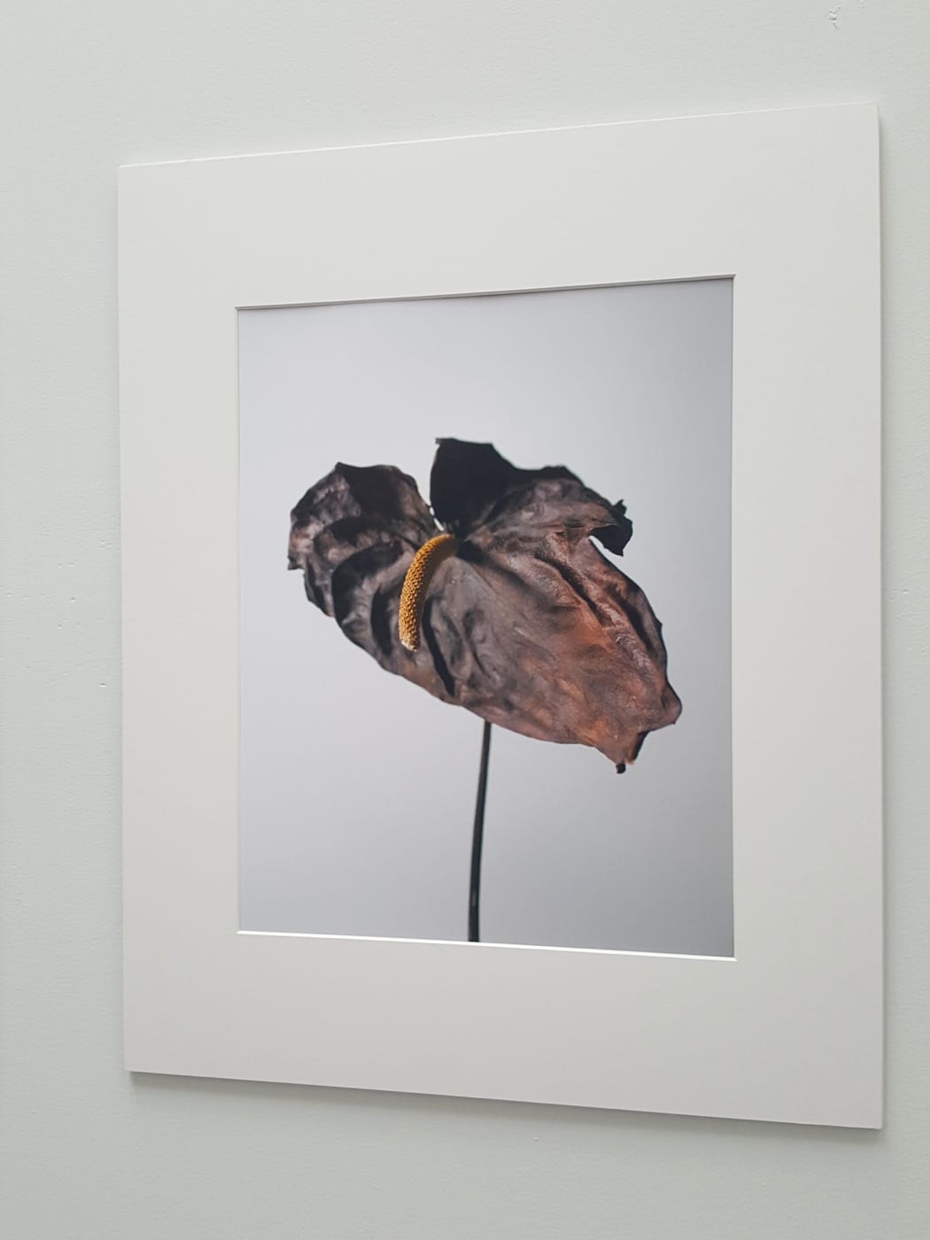 Just so, in BobbiJo McCauley’s lovely print of a decaying flower, which at first glimpse might appear relatively conventional, there is a kind of deep attentiveness to changes in color and texture and shape as the Anthurium andraeanum slowly becomes desiccated. McCauley had a an entire suite of these photographs at her studio at 253 Greenpoint Avenue.