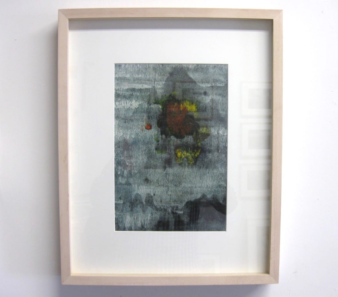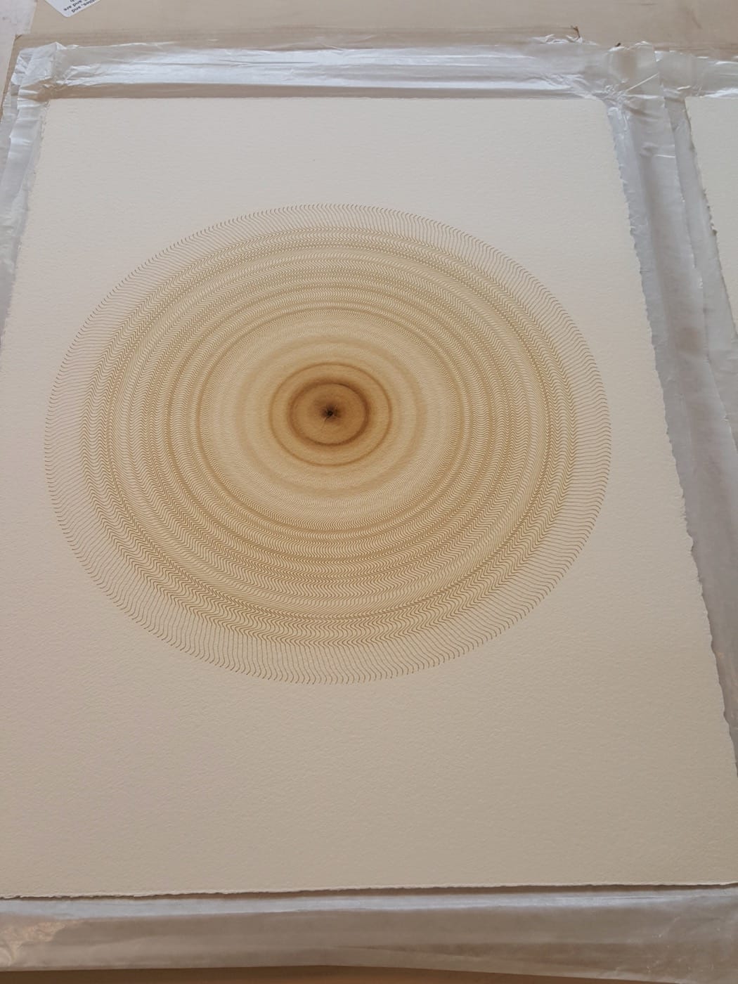 At Plexus Projects at 198 Greenpoint Avenue, Laura Splan showed me her “Blank Slate” (2016), which didn’t immediately visually impress me, but the idea underlying the work is certainly compelling. For the piece, Splan etched her own brain wave patterns by laser into watercolor paper so that they create a kind of radiating pattern, like a miniaturized crop circle.
